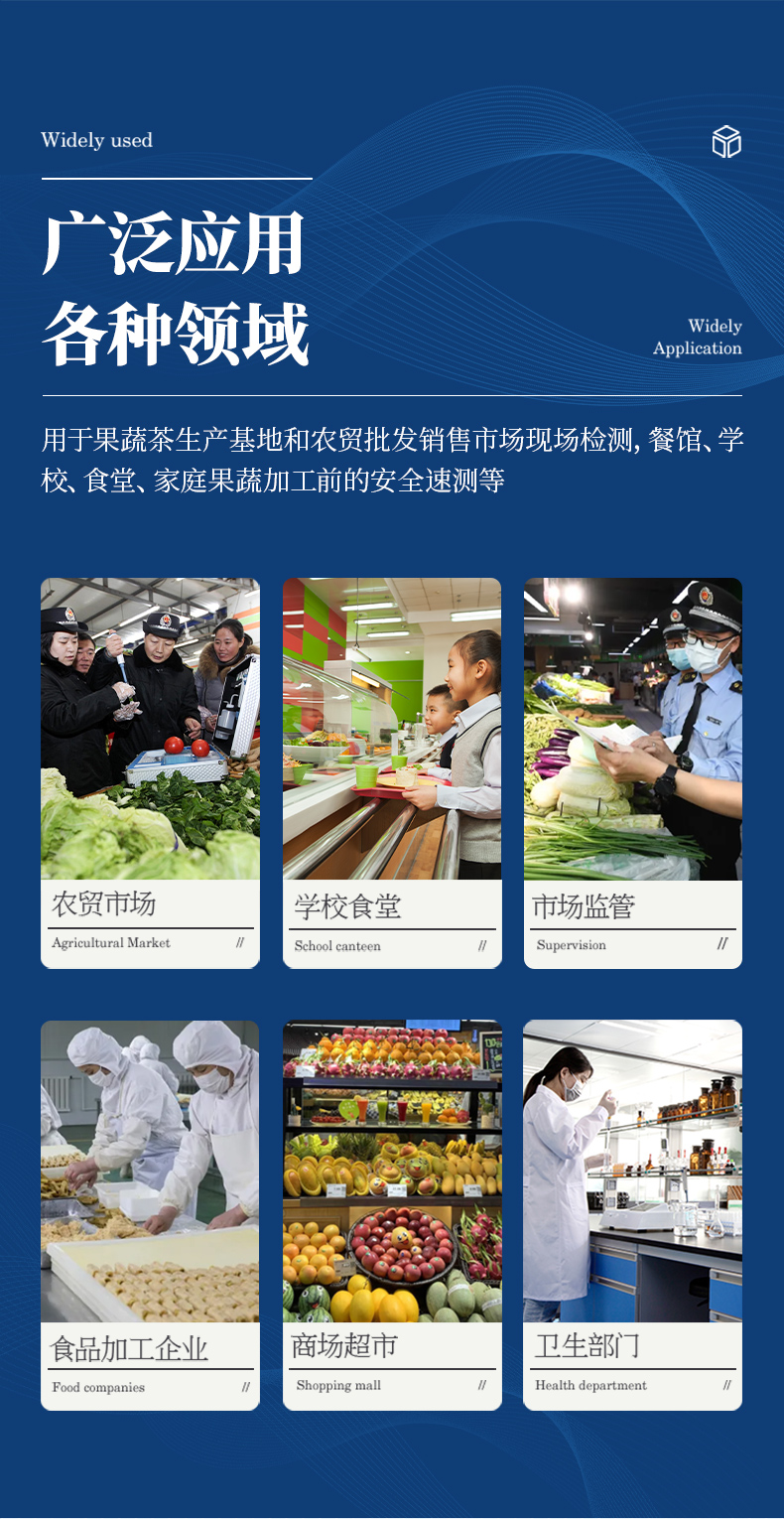 廣泛應用于蔬菜、水果、茶葉、糧食、農副產品等食品中有機磷和氨基甲酸酯類農藥殘留的快速檢測;此外還可用于果蔬茶生產基地和農貿批發銷售市場現場檢測,餐館、學校、食堂、家庭果蔬加工前的安全速測等。