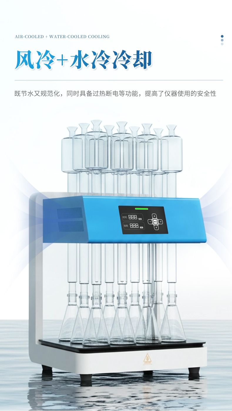 3. 安全性能優(yōu):采用玻璃毛刺回流管代替球形回流管,并以風冷+水冷技術(shù)取代傳統(tǒng)自來水冷卻方式,既可以節(jié)水又能使儀器規(guī)范化,同時具備過熱斷電等功能,提高了儀器使用的安全性。 4.面板易清潔:采用石墨烯加熱板,表面光滑、平整,表面污漬一擦即凈,可減少操作不當對儀器的損壞;