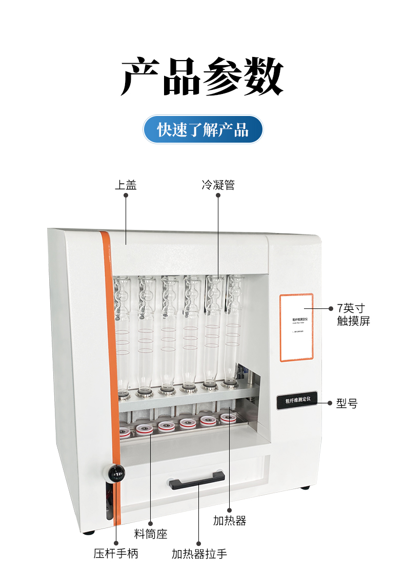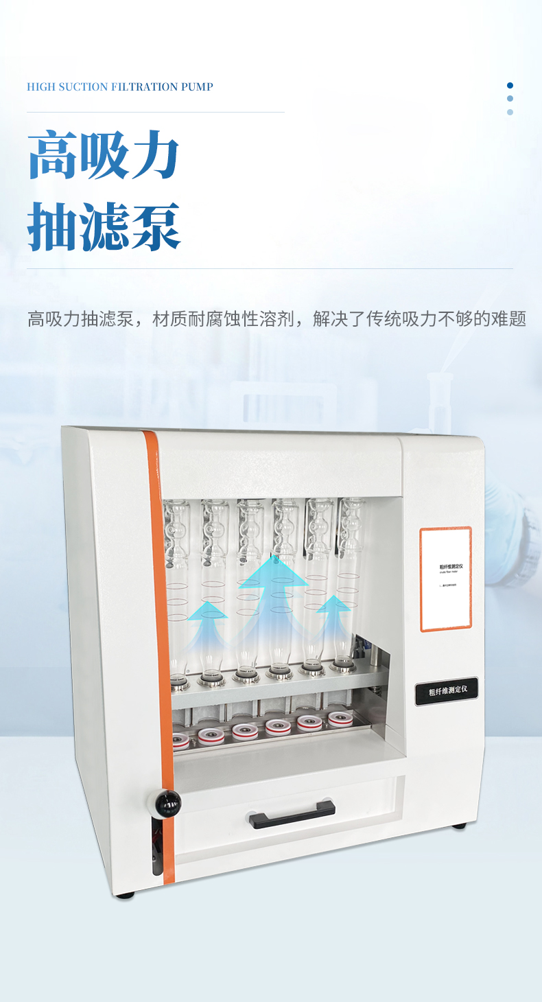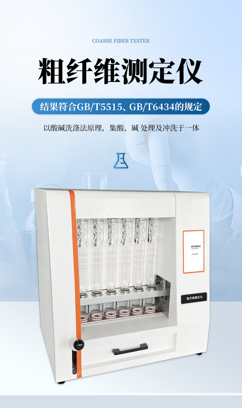 粗纖維測定儀是一款操作簡單、應用靈活的纖維含量檢測儀器,可用于 傳統的溫德法檢測粗纖維和范式法檢測洗滌纖維。它是以酸堿洗滌法原理,集酸、堿 處理及沖洗于一體,采用全封閉電加溫、加液、消煮、抽濾、沖洗的方法來測定纖維 含量。適用于植物、飼料、食品及其它農副產品中粗纖維的測定以及洗滌纖維、纖維 素、半纖維素和其它相關參數測試,其結果符合GB/T5515、GB/T6434的規定。