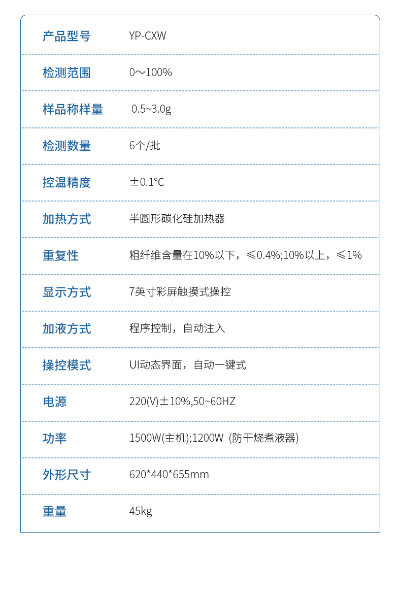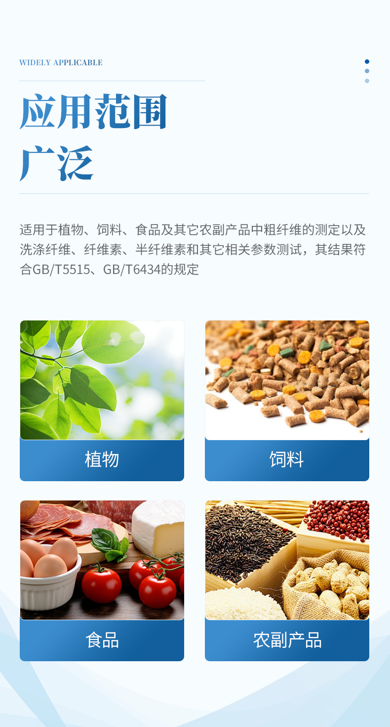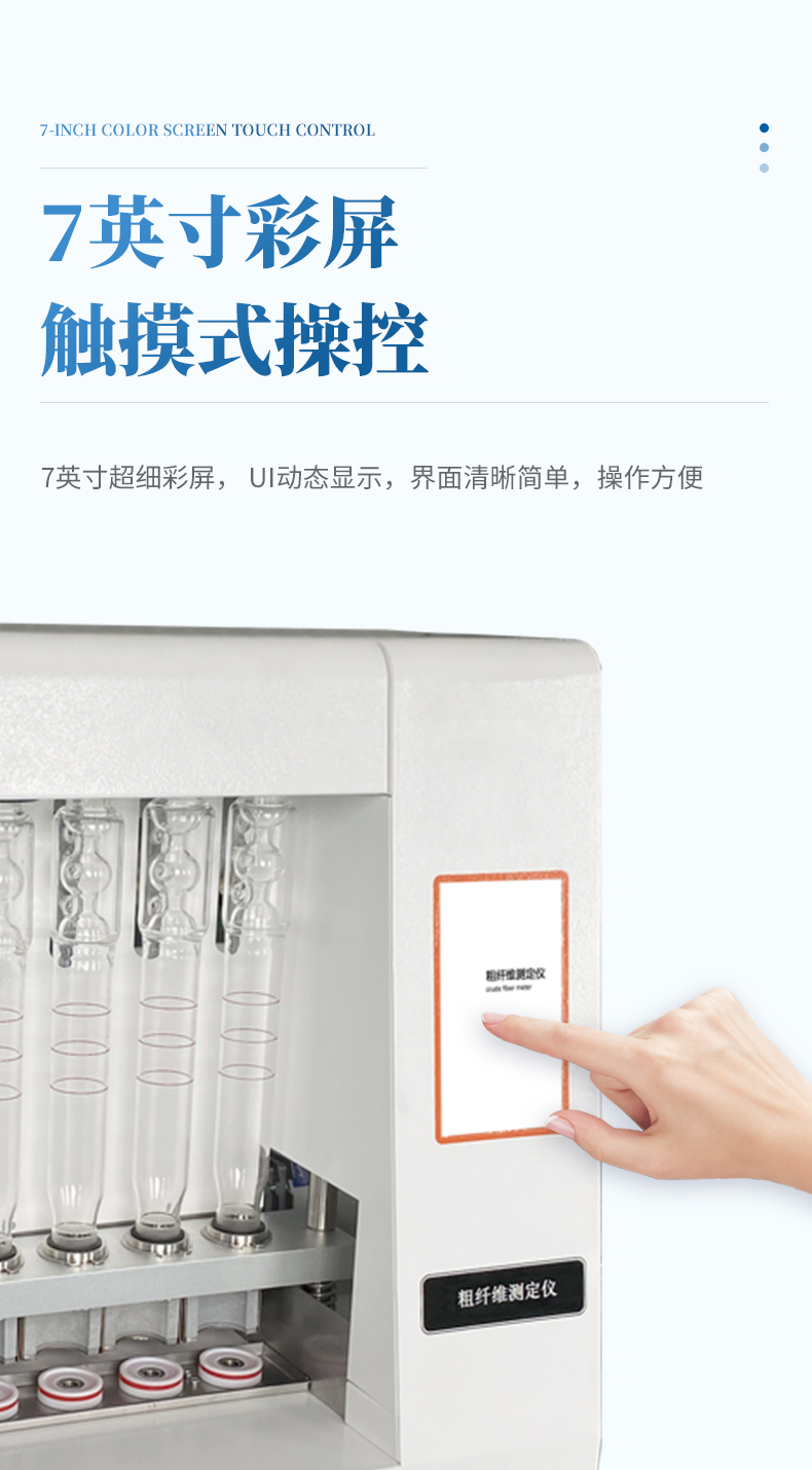 粗纖維測定儀是一款操作簡單、應用靈活的纖維含量檢測儀器,可用于 傳統的溫德法檢測粗纖維和范式法檢測洗滌纖維。它是以酸堿洗滌法原理,集酸、堿 處理及沖洗于一體,采用全封閉電加溫、加液、消煮、抽濾、沖洗的方法來測定纖維 含量。適用于植物、飼料、食品及其它農副產品中粗纖維的測定以及洗滌纖維、纖維 素、半纖維素和其它相關參數測試,其結果符合GB/T5515、GB/T6434的規定。