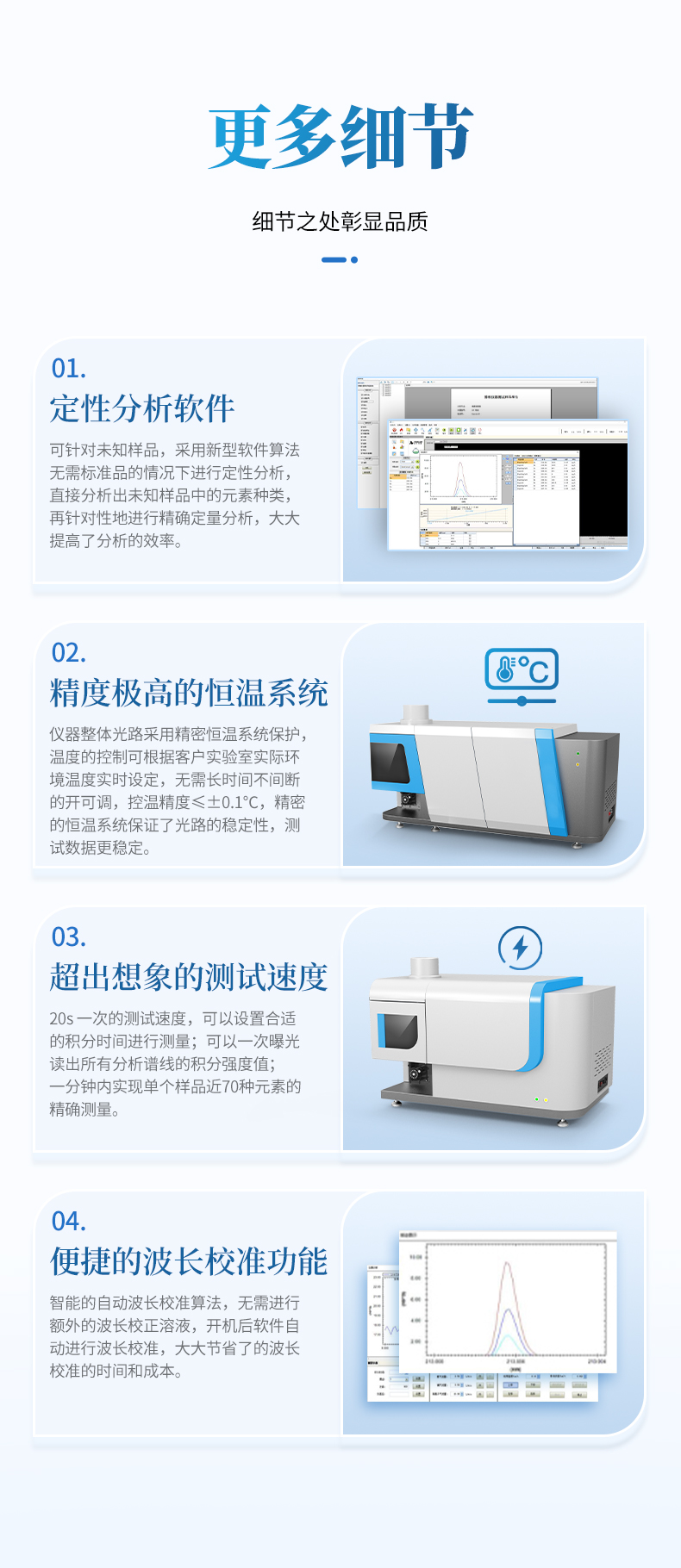 20s 一次的測(cè)試速度,可以設(shè)置合適的積分時(shí)間進(jìn)行測(cè)量;可以一次曝光讀出所有分析譜線的積分強(qiáng)度值;一分鐘內(nèi)實(shí)現(xiàn)單個(gè)樣品近 70 種元素的精確測(cè)量。
