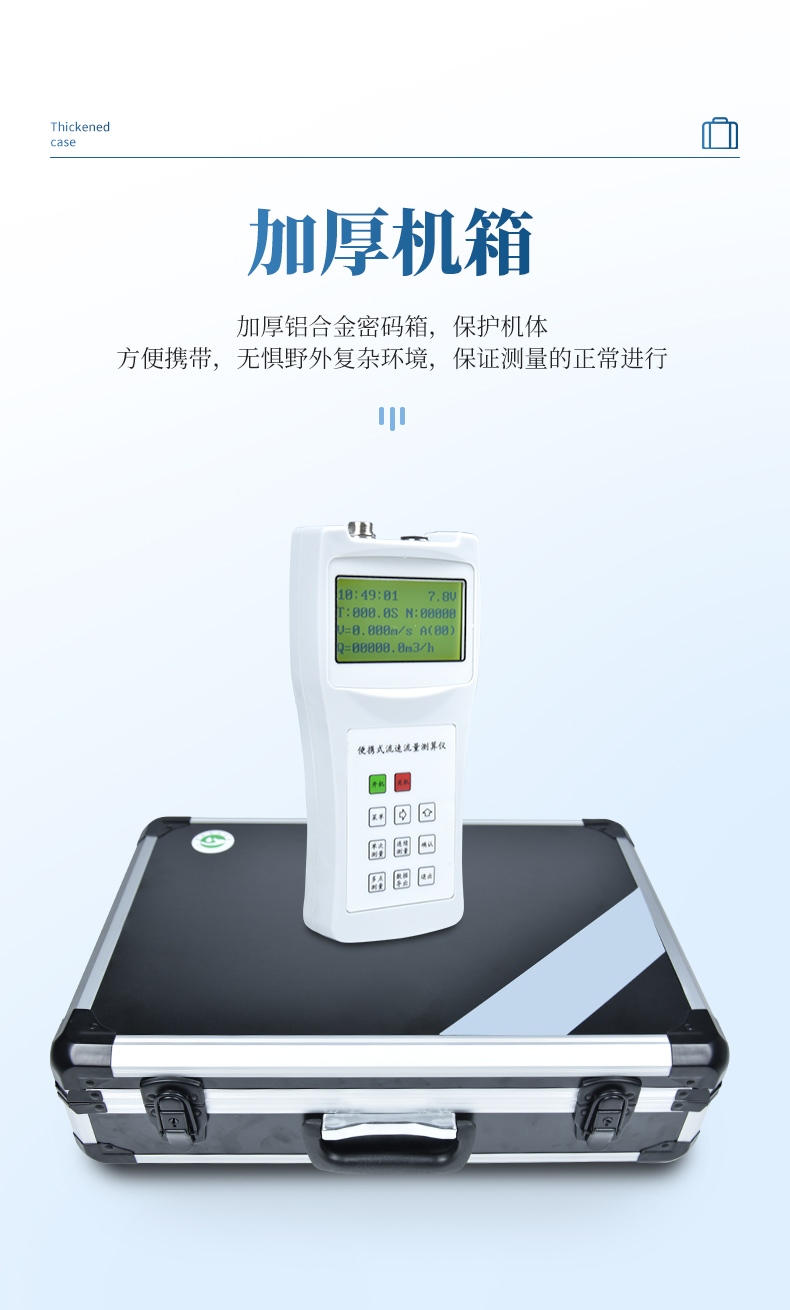 便攜式流速儀主要由LS1206B型旋槳式流速傳感器、流速測算儀、0.4m×4Ф16測桿組成。全套儀器置于高級鋁合金密碼箱內。接通信號線,即可進行各明渠中流速的測量,并自動顯示流速。