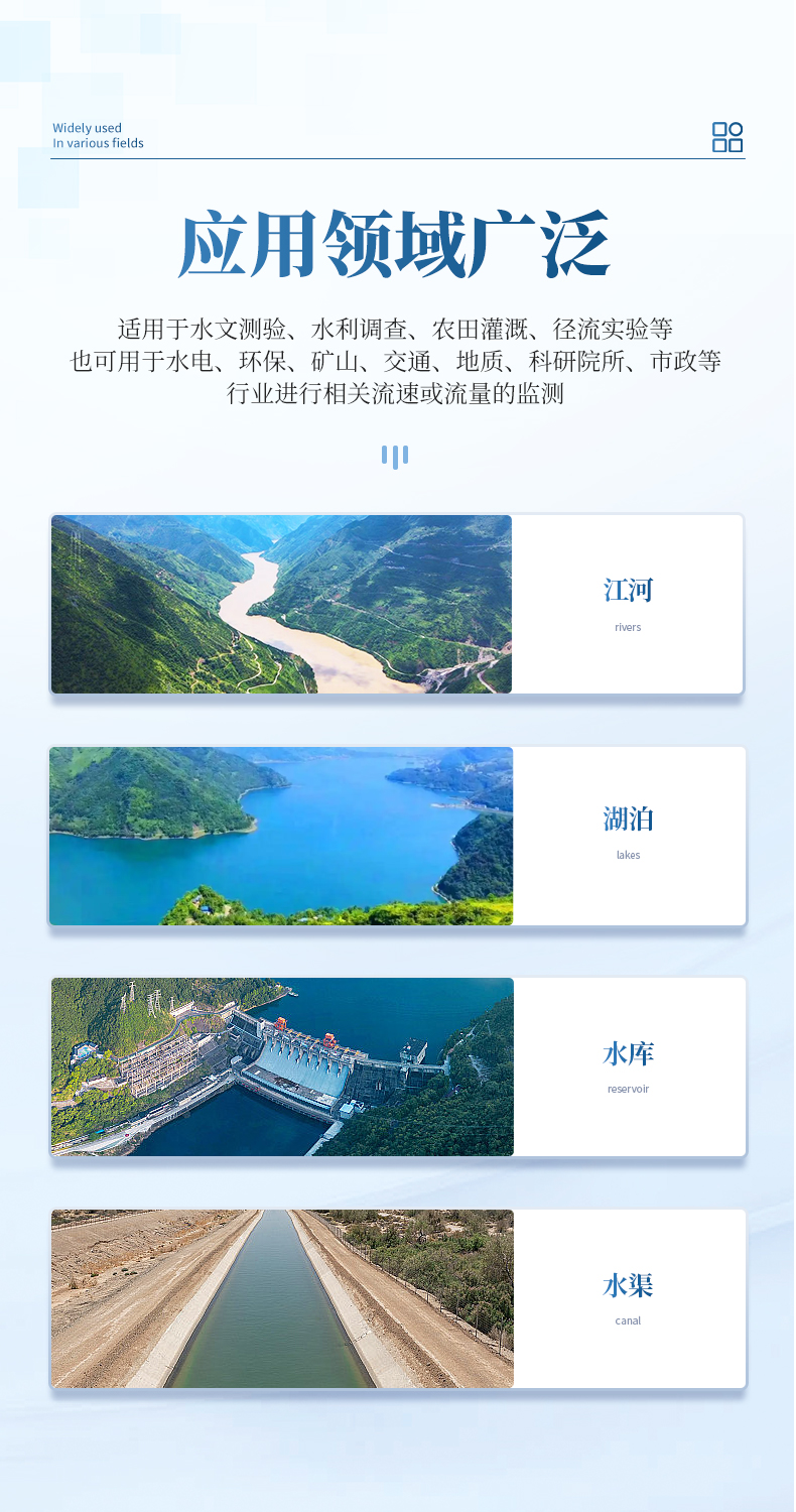該流速儀廣泛適用于水文測驗、水利調查、農田灌溉、徑流實驗等,亦可適用于水電、環保、礦山、交通、地質、科研院所、市政等行業進行相關流速或流量的監測。