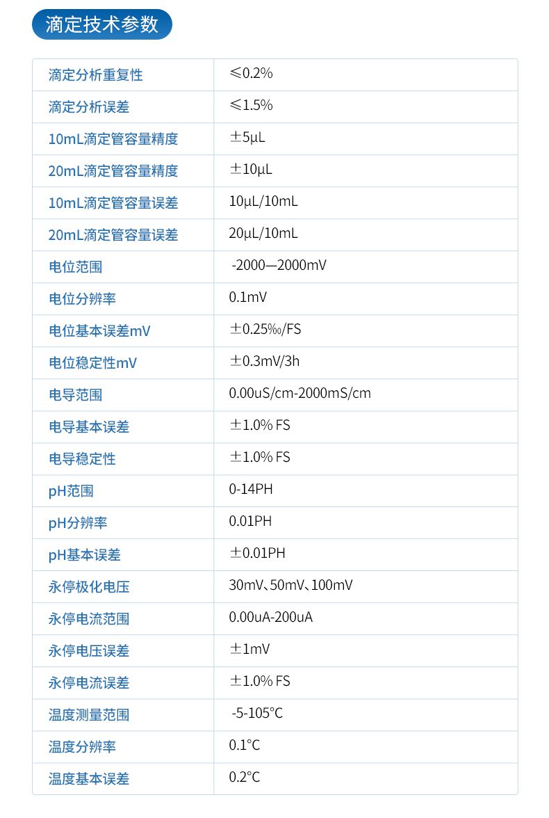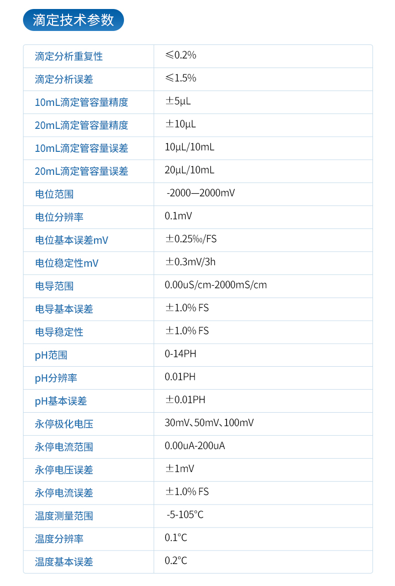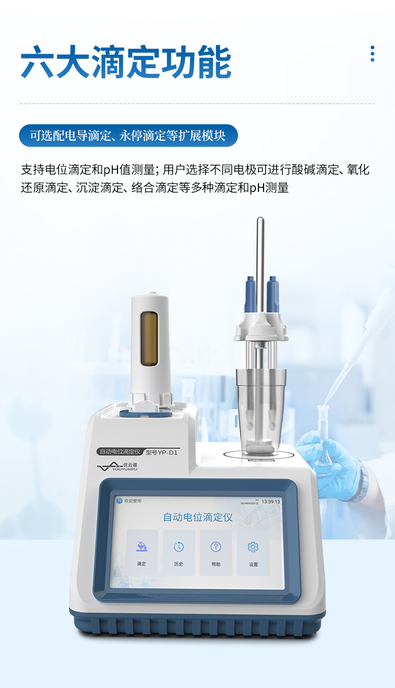 自動電位滴定儀是一種用于化學分析的精密儀器,他通過自動添加滴定劑來確定樣品中特定成分的濃度。該儀器基于電位滴定原理工作,即根據在滴定過程中電池電動勢的變化來確定滴定終點的一款滴定設備。設備滿足國家檢定規程JJG 814-2015《自動電位滴定儀》儀器級別中的0.05級別,即儀器最大示值誤差為±1.5%,儀器示值重復性≤0.2%