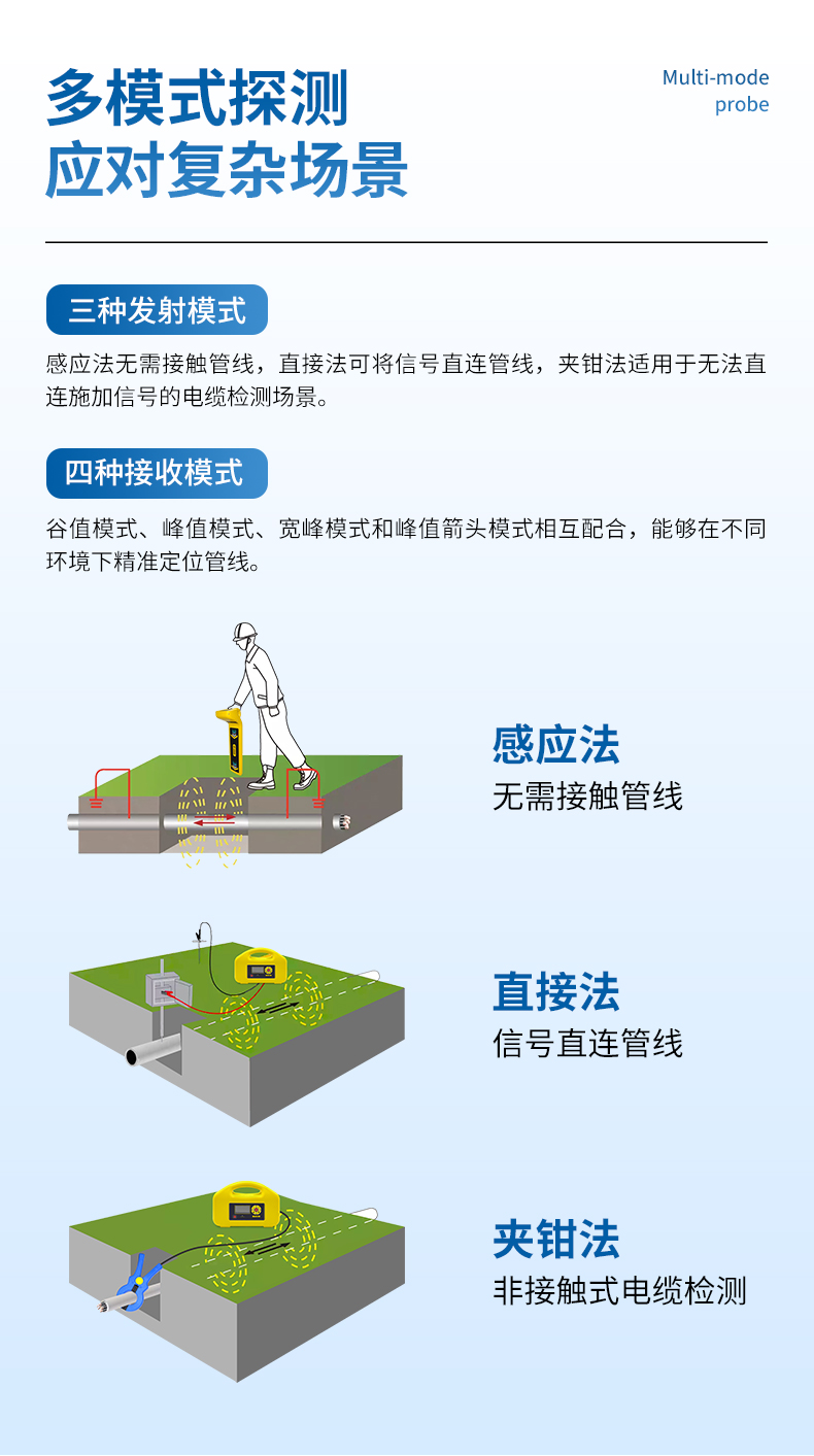 1、 發(fā)射機功能: 具有感應(yīng)法、直接法和夾鉗法三種信號施加模式,適合不同場合需要。