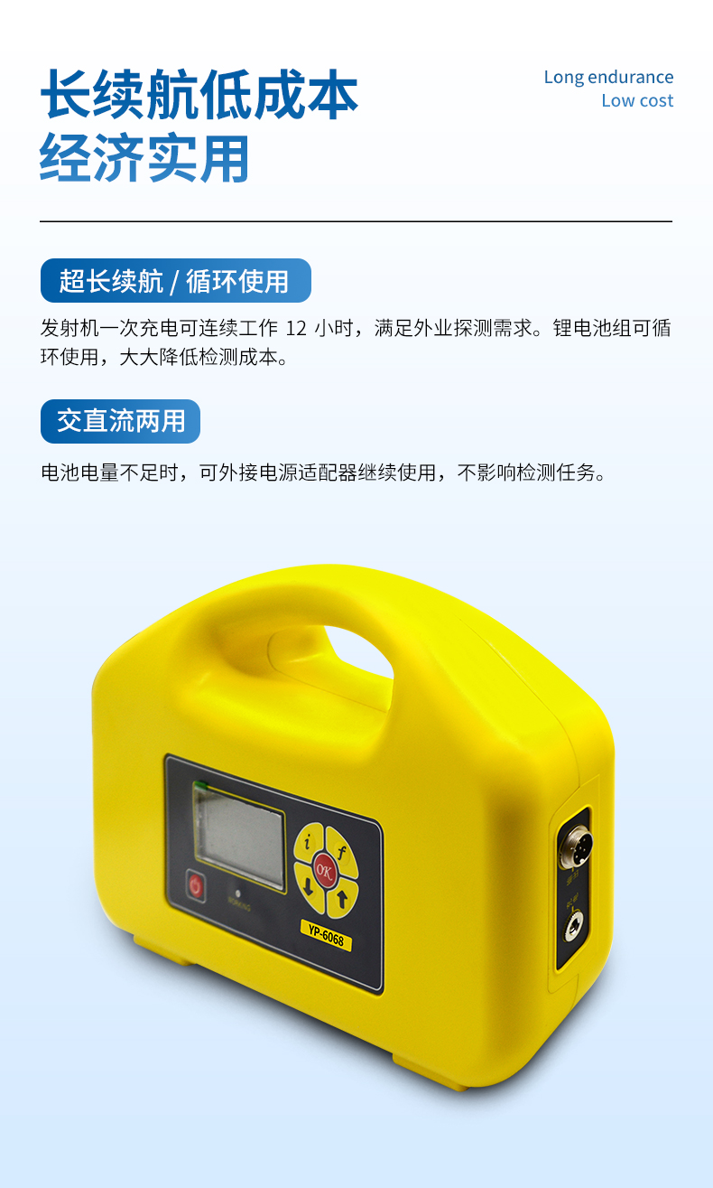 發(fā)射機配備了大容量鋰電池組, 一次充電, 可滿足外業(yè)探測一個工作日供電需要, 并可循環(huán)使用,大大降低了檢測成本。