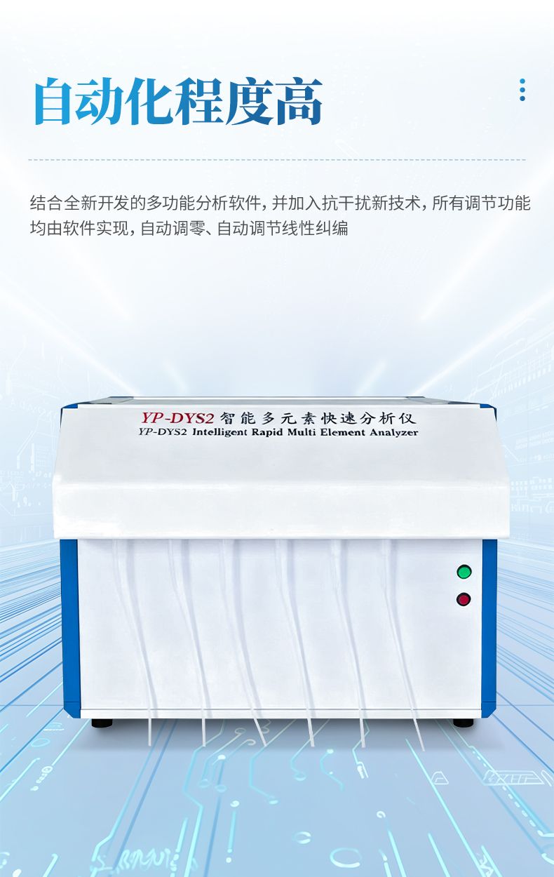 DYS2智能多元素快速分析儀,改善并增大了自動取液裝置,同時,在分析軟件及配套化學分析流程上作了重大改進,樣品稱重增大3倍,取液量也增大3倍,分析相對誤差大大降低,是新一代非常理想的檢測儀器。使用最新的傳感器和微計算機技術,提高了采樣靈敏度和光電數據分辨率,極大地提高了實驗數據的精度。該分析儀具有更高的自動化程度與人性化設計,結合全新開發的多功能分析軟件,并加入我公司開發的抗干擾新技術,所有調節功能均由軟件實現,自動調零、自動調節線性糾編,儀器的穩定性有大幅提高,無須復雜操作,即可大范圍、準確、快速分析二十多個元素的含量,測量精度更高,可靠性更優。在硅酸鹽系統分析領域具有顯著優勢,特別適用于陶瓷、耐火材料、玻璃、水泥、無機非金屬礦等行業的定量分析。該產品在大中專院校、科研院所、廠礦企業得到廣泛應用,并廣銷全國各地及東南亞、中東、非洲、中國臺灣等,均收到良好效果。