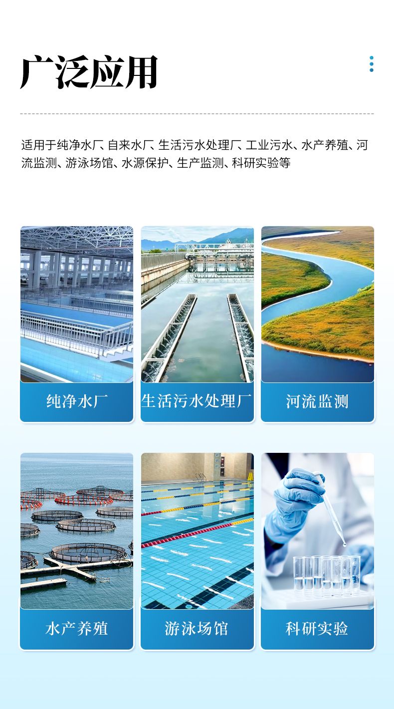 適用于純凈水廠、自來水廠、生活污水處理廠、工業污水、水產養殖、河流監測、游泳場館、水源保護、生產監測、科研實驗等。