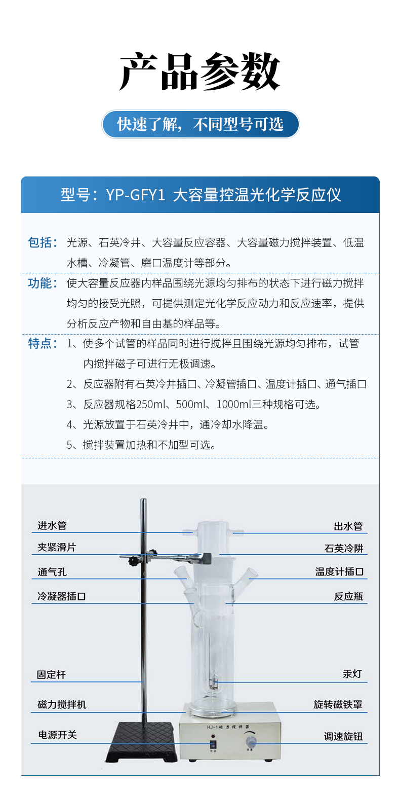 包括:光源、石英冷井、大容量反應容器、大容量磁力攪拌裝置、低溫水槽、冷凝管、磨口溫度計等部分。 功能:使大容量反應器內樣品圍繞光源均勻排布的狀態下進行磁力攪拌均勻的接受光照,可提供測定光化學反應動力和反應速率,提供分析反應產物和自由基的樣品等。 特點:1、使多個試管的樣品同時進行攪拌且圍繞光源均勻排布,試管內攪拌磁子可進行無極調速。 2、反應器附有石英冷井插口、冷凝管插口、溫度計插口、通氣插口 3、反應器規格250ml、500ml、1000ml三種規格可選。 4、光源放置于石英冷井中,通冷卻水降溫。 5、攪拌裝置加熱和不加型可選。