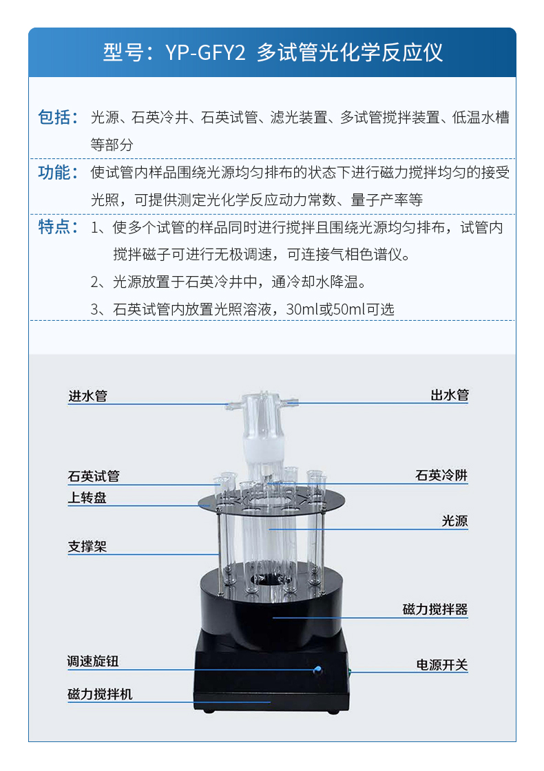 | YP-GFY2 多試管反應器 | 包括:光源、石英冷井、石英試管、濾光裝置、多試管攪拌裝置、低溫水槽等部分。 功能:使試管內樣品圍繞光源均勻排布的狀態下進行磁力攪拌均勻的接受光照,可提供測定光化學反應動力常數、量子產率等 特點:1、使多個試管的樣品同時進行攪拌且圍繞光源均勻排布,試管內攪拌磁子可進行無極調速,可連接氣相色譜儀。 2、光源放置于石英冷井中,通冷卻水降溫。 3、石英試管內放置光照溶液,30ml或50ml可選 |