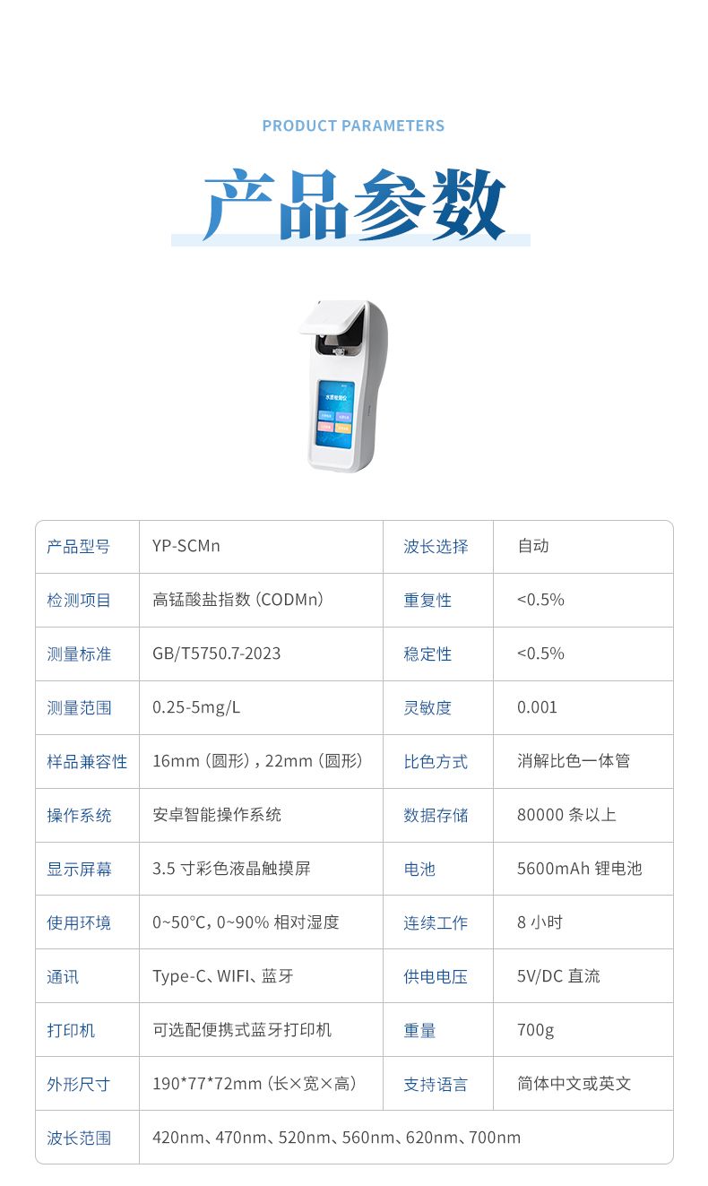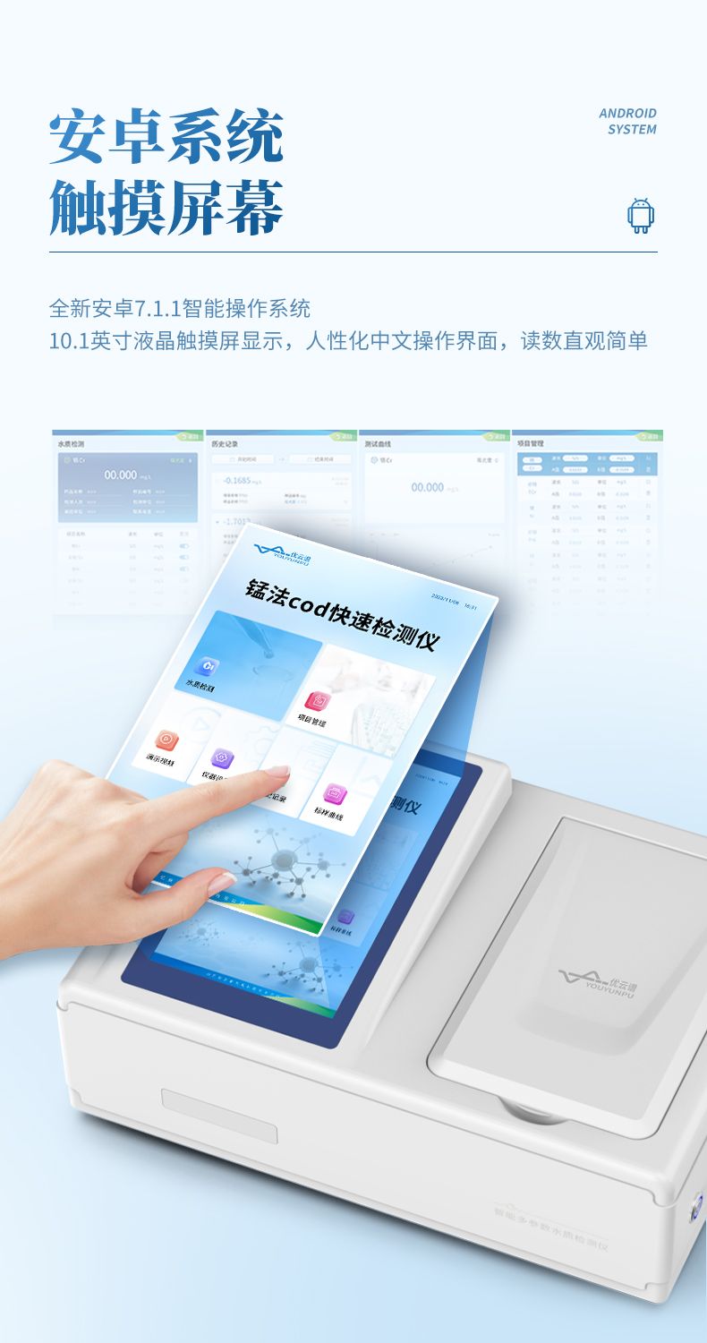手持式高錳酸鹽指數測定儀是依據最新的生活飲用水標準檢驗方法《GB/T 5750.7-2023》設計制造。本儀器主要檢測水質高錳酸鹽指數濃度指標;儀器配備高清晰度彩色液晶觸摸顯示屏,Android智能操作系統,中文顯示界面,中英文鍵盤,人性化操作,使用更簡單;搭配6孔智能消解儀,可實現戶外快速檢測。