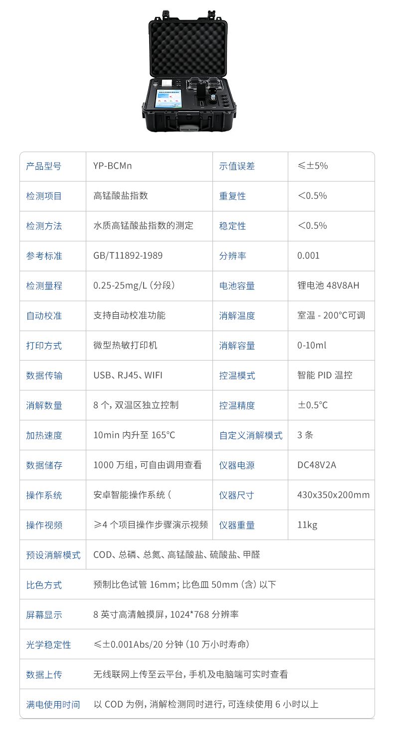 高錳酸鹽指數檢測儀(CODMn)是參考標準《GB/T 11892-1989 水質高錳酸鹽指數的測定》設計制造,適用于國內外眾多檢測標準。
