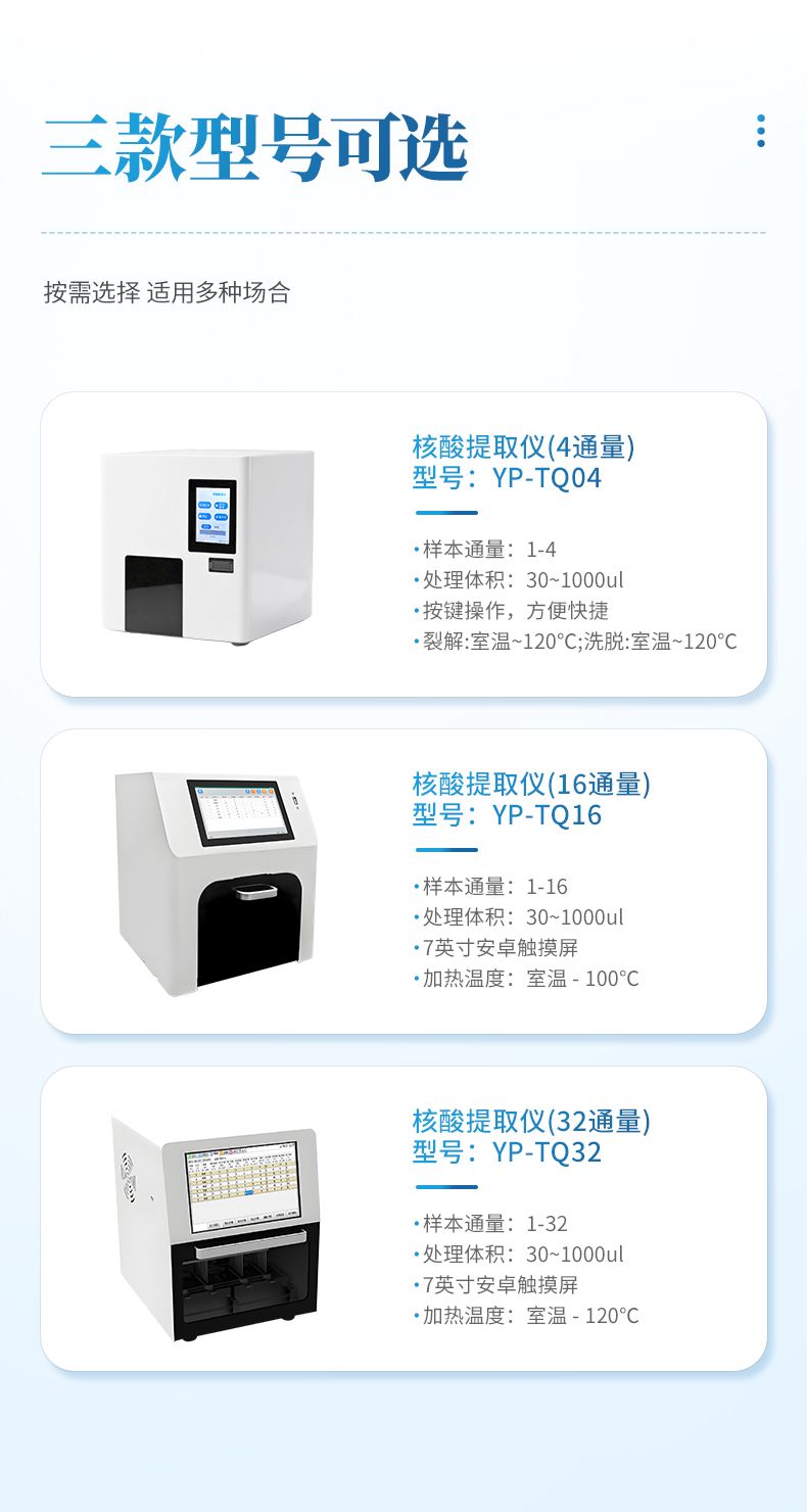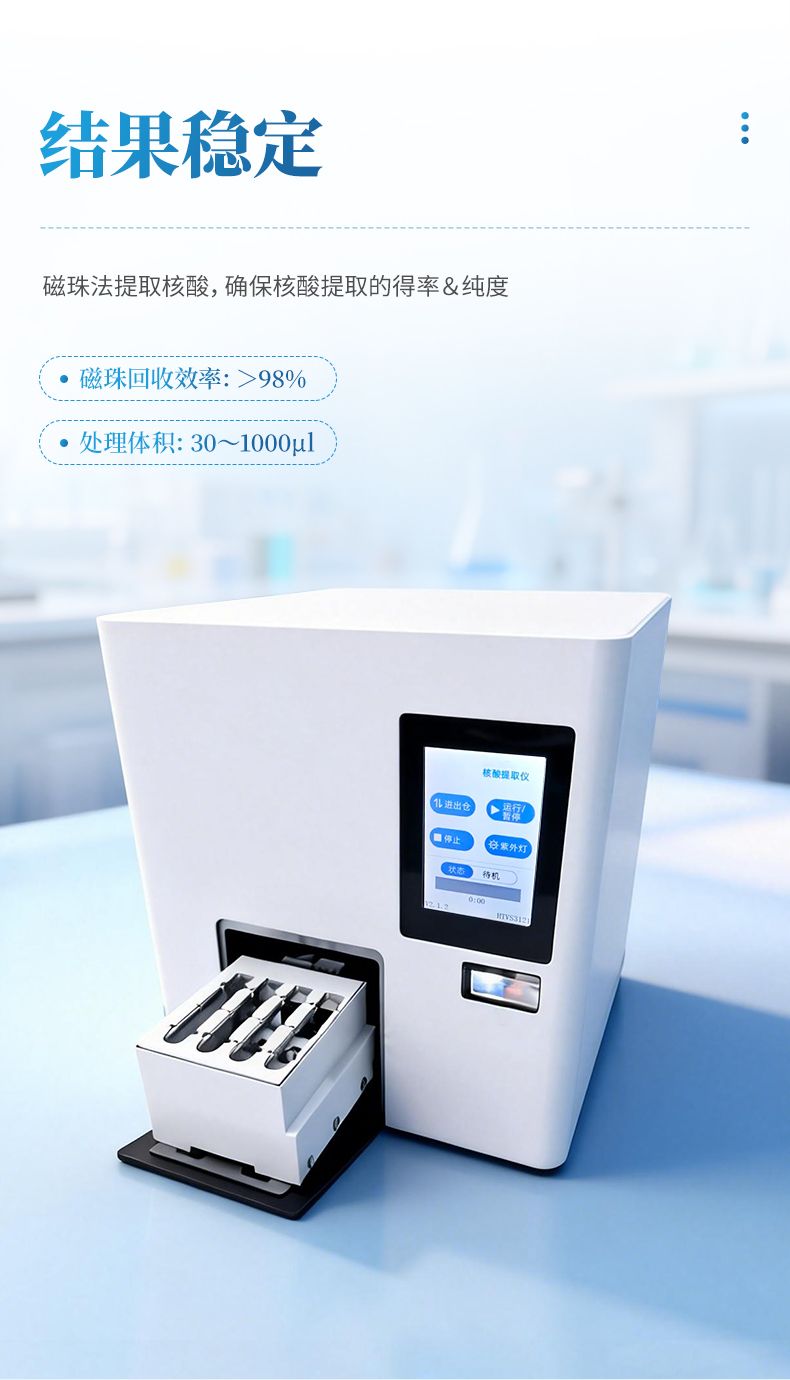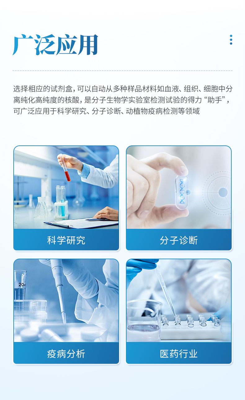 核酸提取儀通過磁珠法提取核酸,選擇相應的試劑盒就可以自動的從多種樣品材料如血液、組織、細胞中分離純化高純度的核酸。具有兼容性強(適配預封裝提取試劑盒,也可適配單頭份試劑)、提取速度快、提取回收率高、操作簡便的優點,是分子生物學實驗室檢測試驗的得力“助手”??蓮V泛應用于科學研究、分子診斷、動植物疫病檢測等領域。