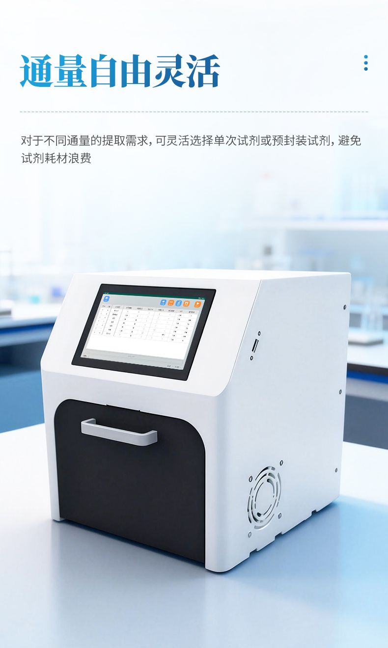 核酸提取儀通過(guò)磁珠法提取核酸,選擇相應(yīng)的試劑盒就可以自動(dòng)的從多種樣品材料如血液、組織、細(xì)胞中分離純化高純度的核酸。具有兼容性強(qiáng)(適配預(yù)封裝提取試劑盒,也可適配單頭份試劑)、提取速度快、提取回收率高、操作簡(jiǎn)便的優(yōu)點(diǎn),是分子生物學(xué)實(shí)驗(yàn)室檢測(cè)試驗(yàn)的得力“助手”。可廣泛應(yīng)用于科學(xué)研究、分子診斷、動(dòng)植物疫病檢測(cè)等領(lǐng)域。