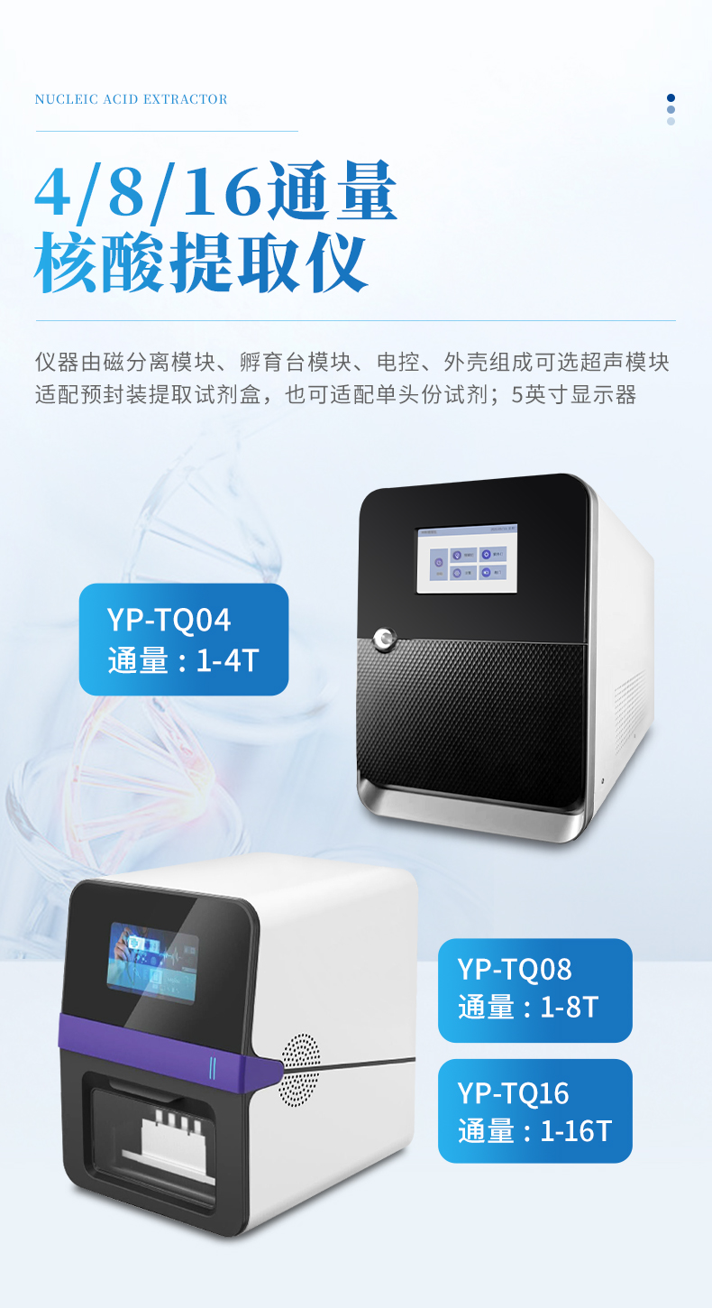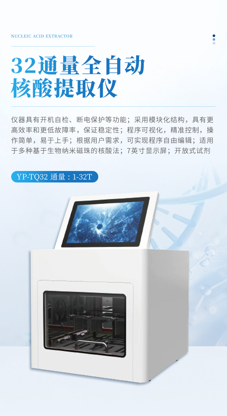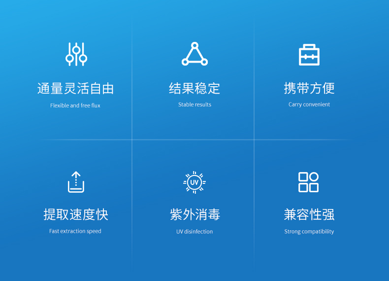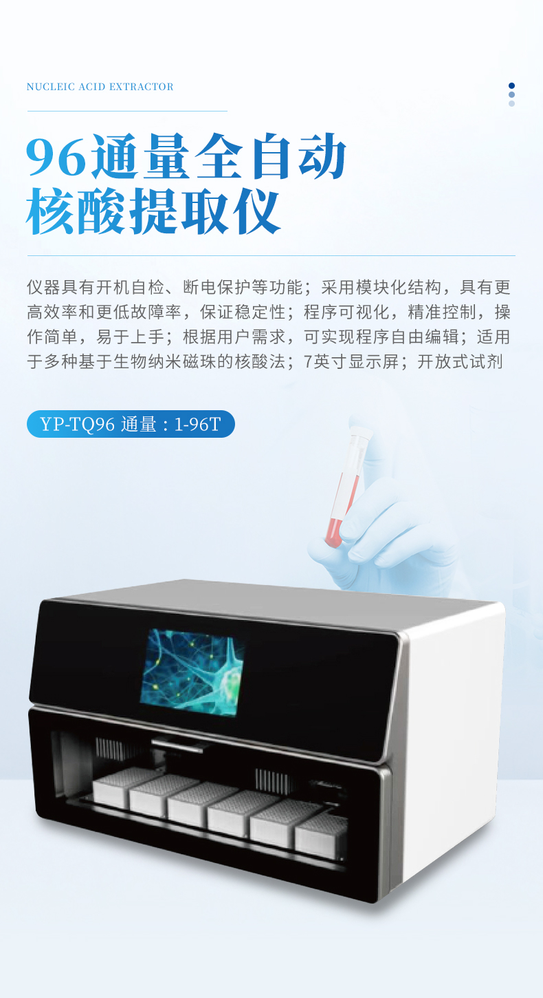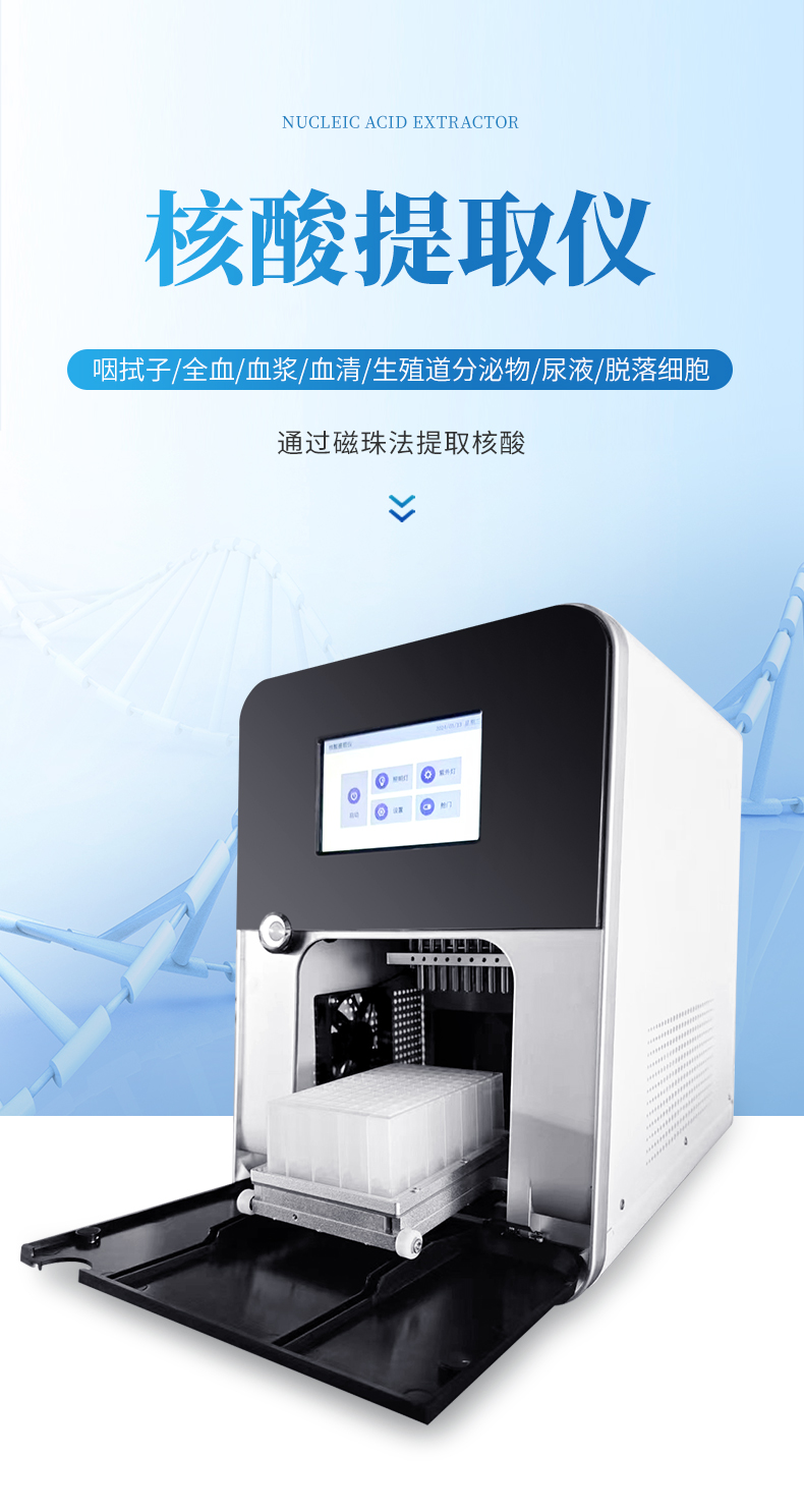 核酸提取儀通過磁珠法提取核酸,選擇相應的試劑盒就可以自動的從多種樣品材料如血液、組織、細胞中分離純化高純度的核酸。具有兼容性強(適配預封裝提取試劑盒,也可適配單頭份試劑)、提取速度快、提取回收率高、操作簡便的優點,是分子生物學實驗室檢測試驗的得力“助手”。可廣泛應用于科學研究、分子診斷、動植物疫病檢測等領域。