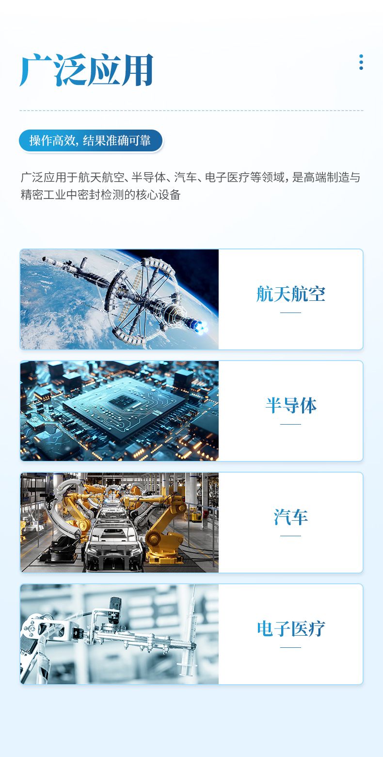 氦質譜檢漏儀是采用質譜學原理、以氦氣為示漏氣體的高精度無損檢漏設備,憑借氦氣大氣含量低、質荷比特征鮮明的優勢,實現超高靈敏度檢漏,可精準定位并定量漏點。設備支持真空噴氦、吸槍掃描、背壓累積等多種檢漏模式,適配真空 / 帶壓容器、密封組件、精密器件等不同檢測需求,廣泛應用于航天航空、半導體、汽車、電子醫療等領域,是高端制造與精密工業中密封檢測的核心設備。