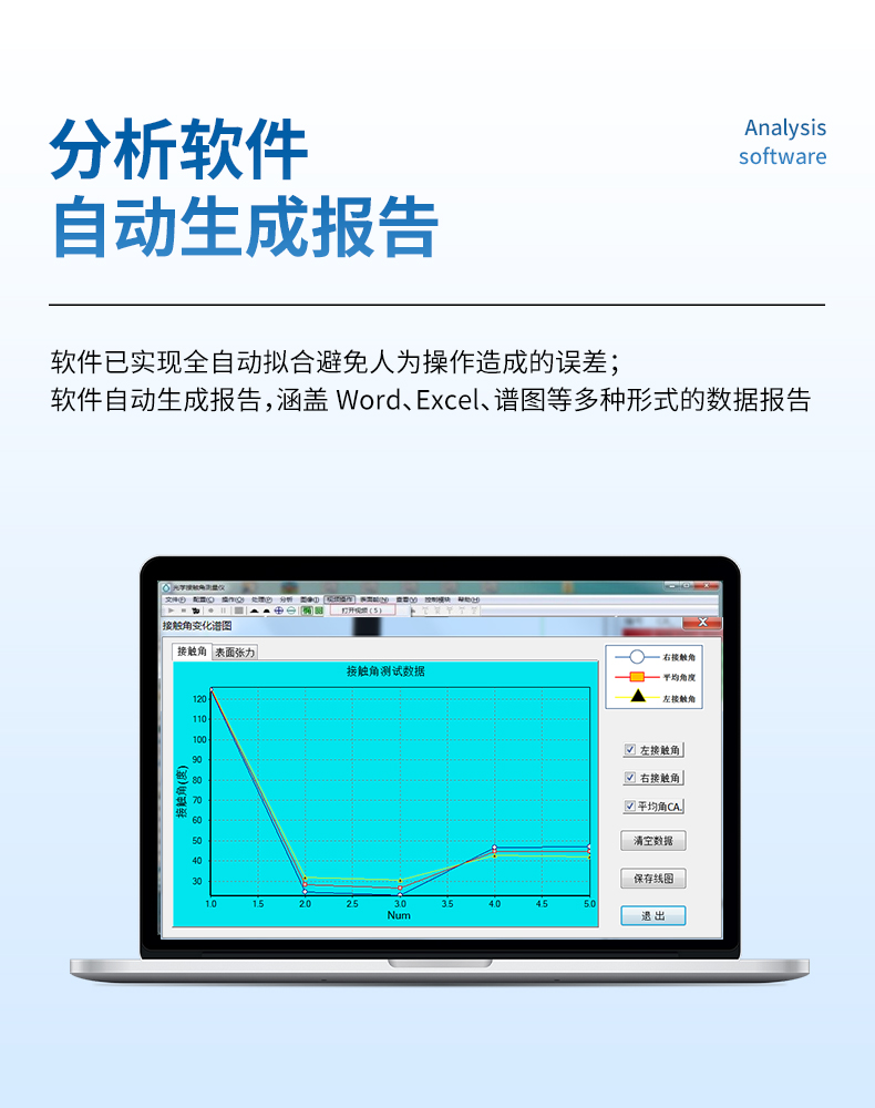 分析軟件功能強大,具備一鍵式全自動擬合能力,具備國際最領先的擬合方法,滿足各種液滴形態的精確擬合;