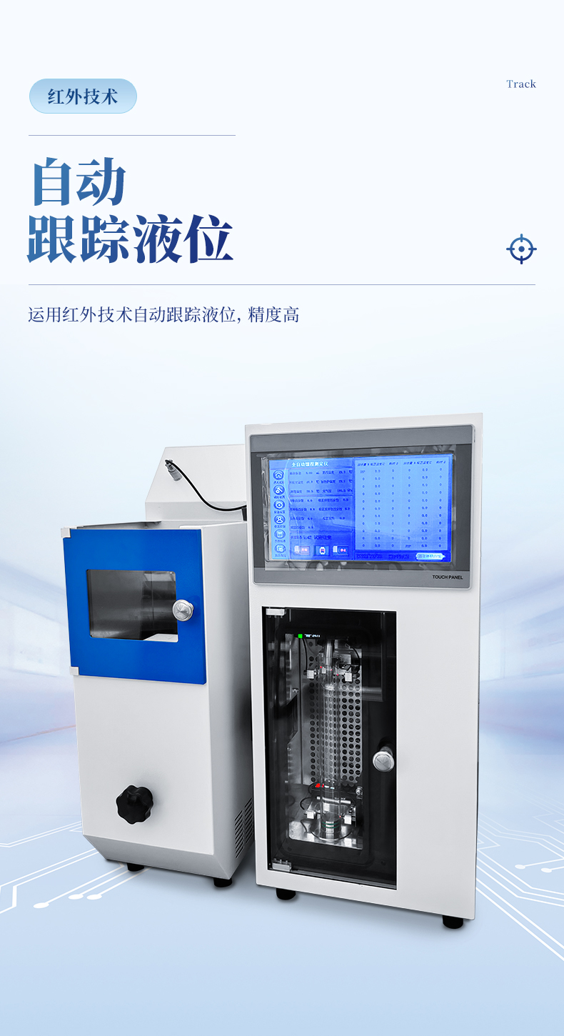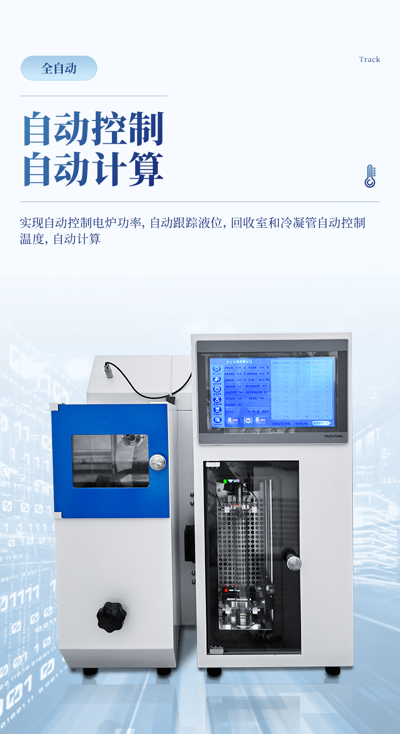 8.儀器實現自動控制電爐功率,自動跟蹤液位,回收室和冷凝管自動控制溫度,自動計算。