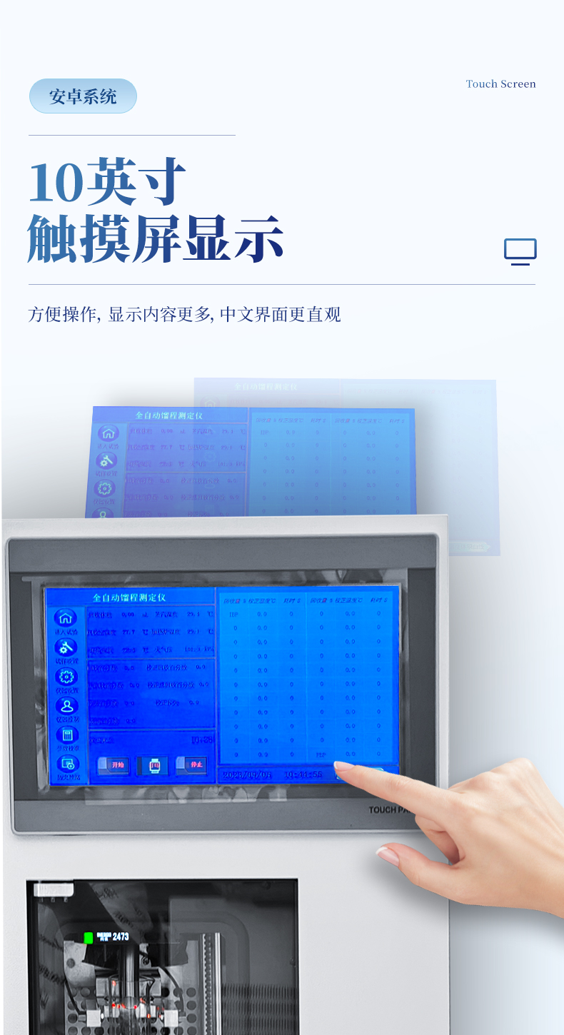 2.操作采用電容式觸摸屏,其優點在于無機械損耗、防塵防水、抗射頻干擾、使用壽命長。