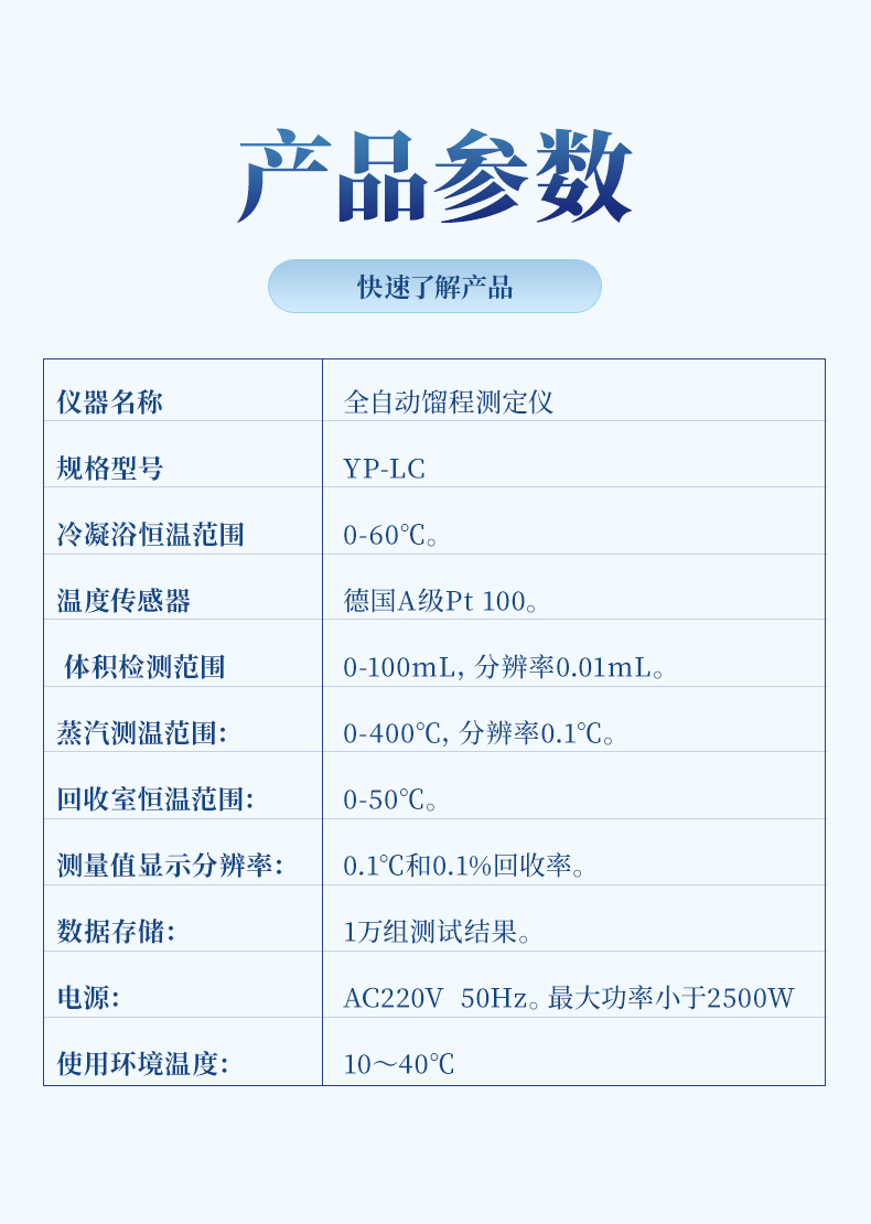 感謝您選用YP-LC全自動餾程測定儀,該儀器依據國標GB/T 18255-2000、GB/T 7534-2004 GB/T 3146.1-2010、GB/T 18589-2001試驗方法設計、制造的。適用于天然汽油(穩定輕烴)、車用汽油、航空汽油、噴氣燃料、特殊沸點的溶劑、石腦油、煤油、煤焦油、柴油、粗柴油餾分燃料和相似的石油產品的餾程測定。