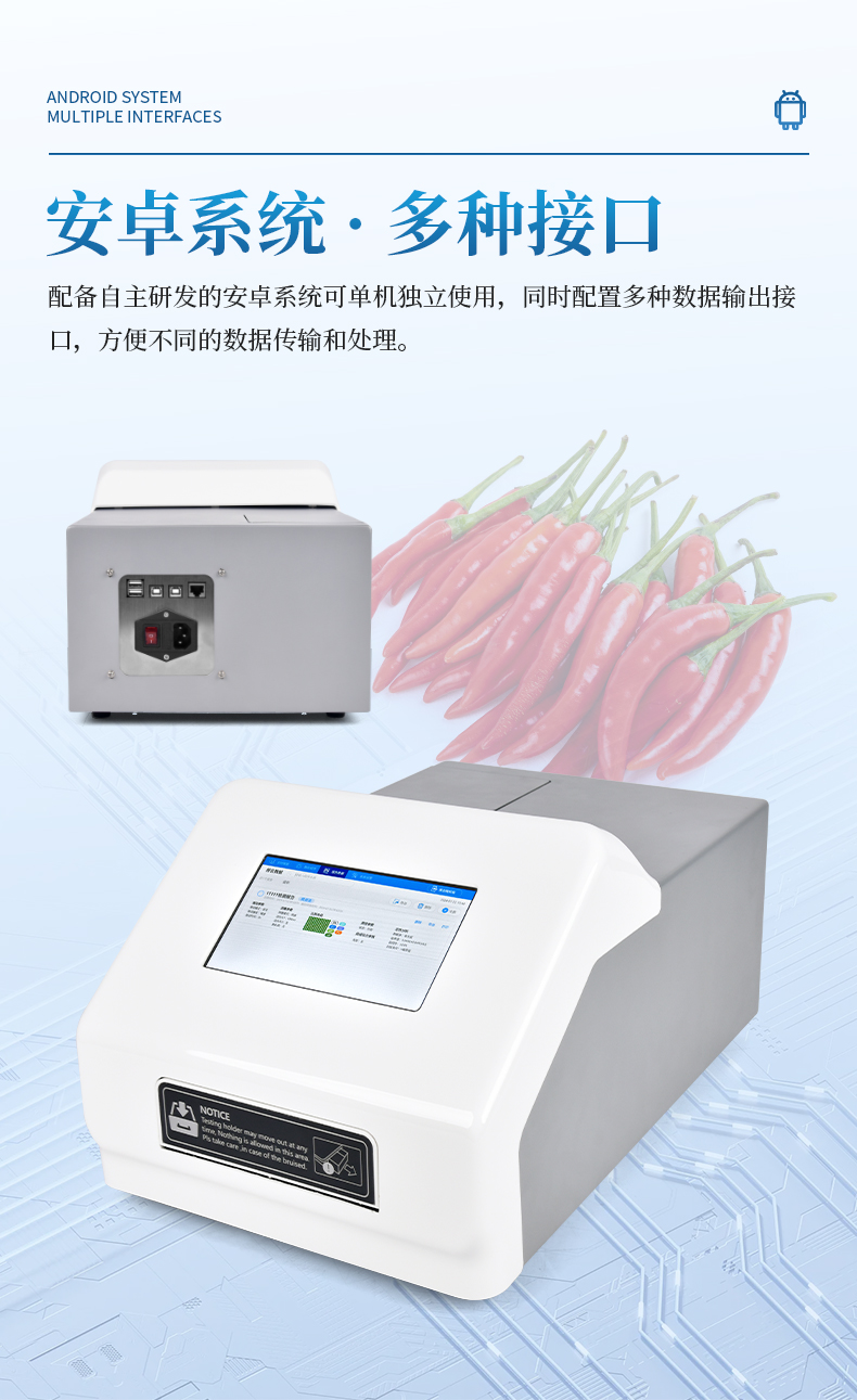 手持式辣度檢測(cè)儀采用電化學(xué)測(cè)量方法,可快速、便捷地檢測(cè)各種辣椒及辣椒制品中的天然辣椒素的等級(jí),適用于干辣椒、鮮辣椒、辣椒粉等天然辣椒及其制品的快速檢測(cè)。