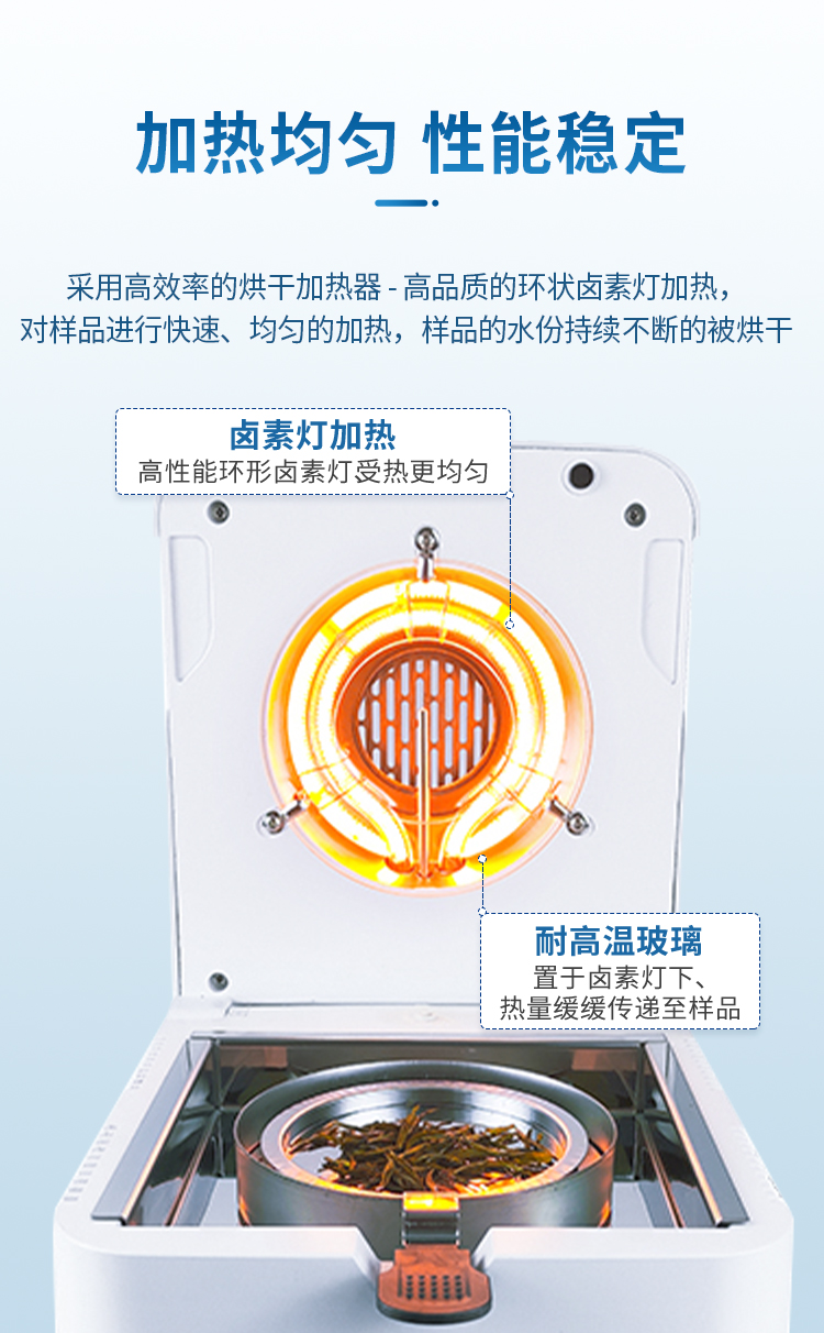 該系列快速水分測定儀應用了國際烘箱干燥法原理,測定結果與烘箱法水分測定具有良好的一致性,工作效率卻遠遠高于烘箱法水分測定,一般樣品只需要幾分鐘即可測量完畢,因此受到廣大用戶的青睞與好評。