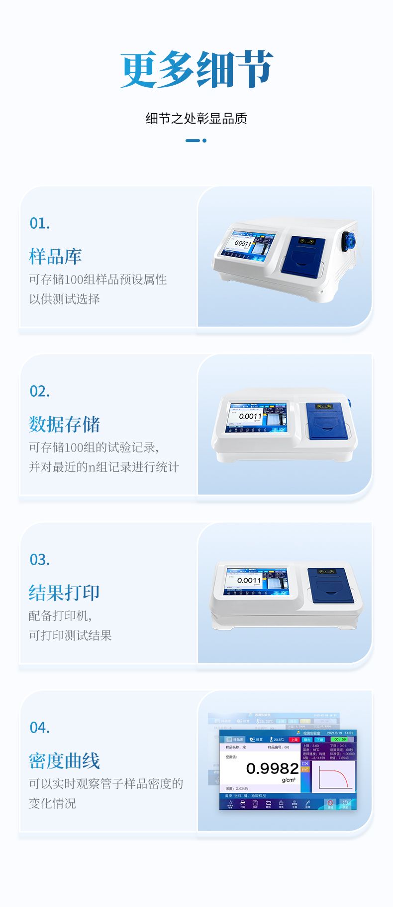 恒溫電子式液體密度計(jì)還能配合相應(yīng)液體的密度濃度轉(zhuǎn)換軟件,直接讀出濃度值。并且有校準(zhǔn)、采樣、恒溫控制、測(cè)試、清理、干燥、操作提示、觀察窗、密度曲線、樣品庫、數(shù)據(jù)儲(chǔ)存、數(shù)據(jù)統(tǒng)計(jì)、結(jié)果打印等功能,使用和保養(yǎng)更加方便。