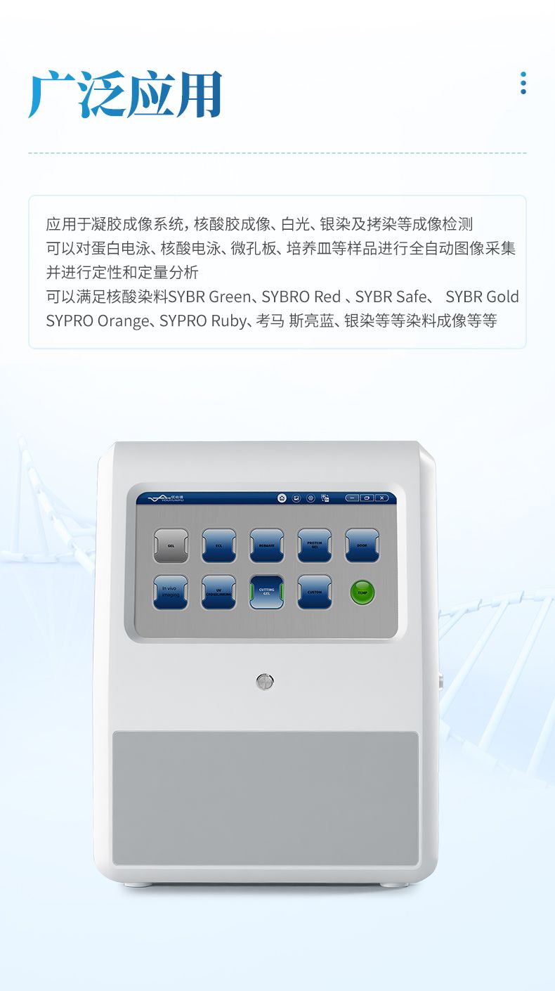 應用于凝膠成像系統,核酸膠成像、白光、銀染及拷染等成像檢測。可以對蛋白電泳、核酸電泳、微孔板、培養皿等樣品進行全自動圖像采集并進行定性和定量分析。可以滿足核酸染 料 SYBR Green、SYBRO Red 、SYBR Safe、 SYBR Gold、SYPRO Orange、SYPRO Ruby、考馬 斯亮藍、銀染等等染料成像等等