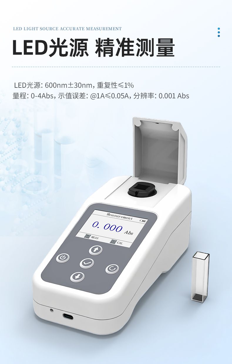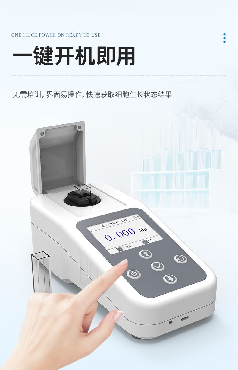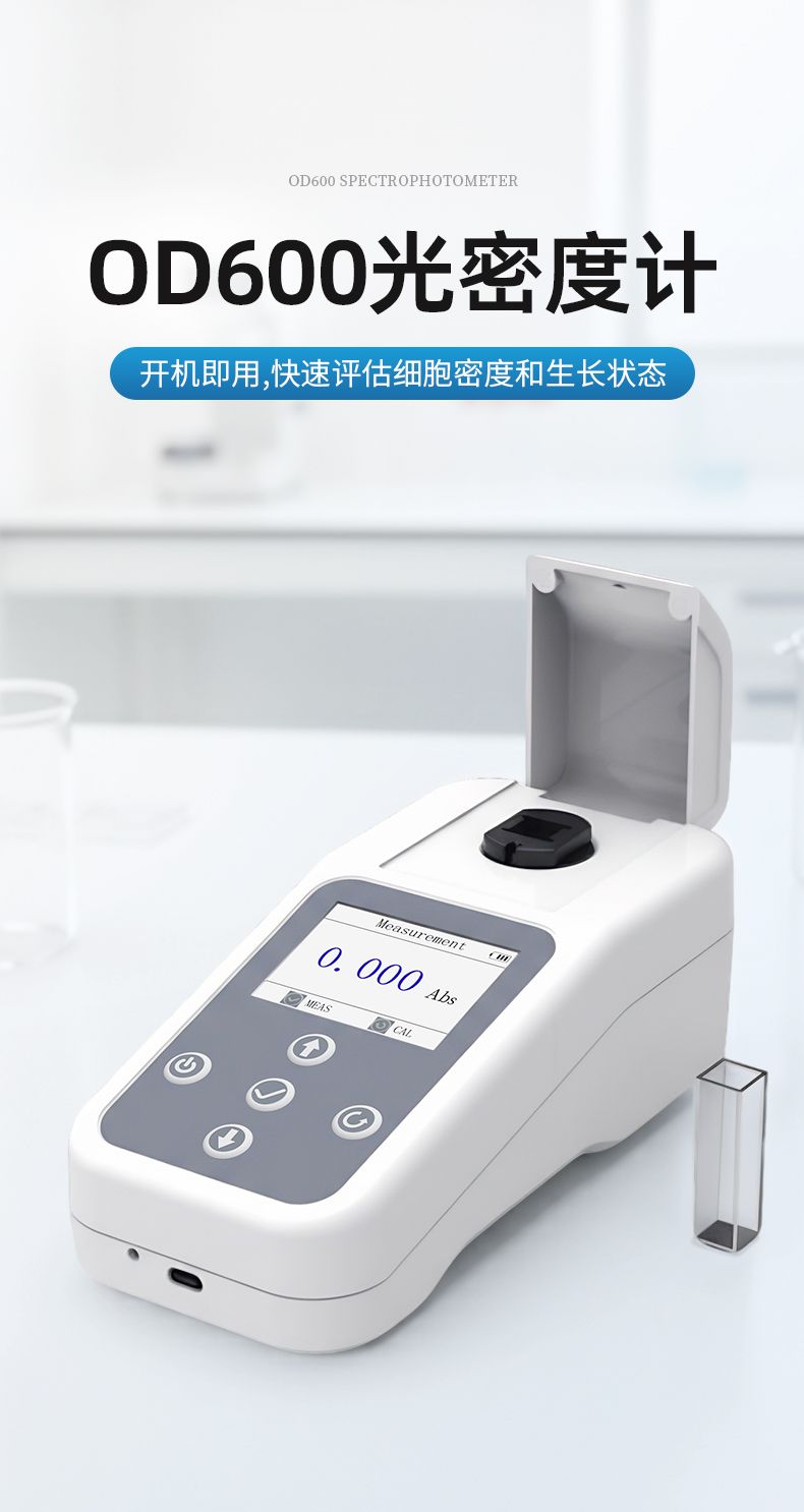 OD600是一款測量0-4Abs范圍內細菌等培養液在600nm波長下的吸光度 (Optical Density,OD), 從而間接評估細胞密度和生長狀態的儀器。基于朗伯-比爾定律 (Lambert-Beer Law): 當波長為600nm的光穿過樣品時,細胞會散射和吸收光線,吸光度 (OD 值)與細胞密度成正比。可廣泛應用于微生物學、分子生物學、發酵工程和生物制藥等領域。
