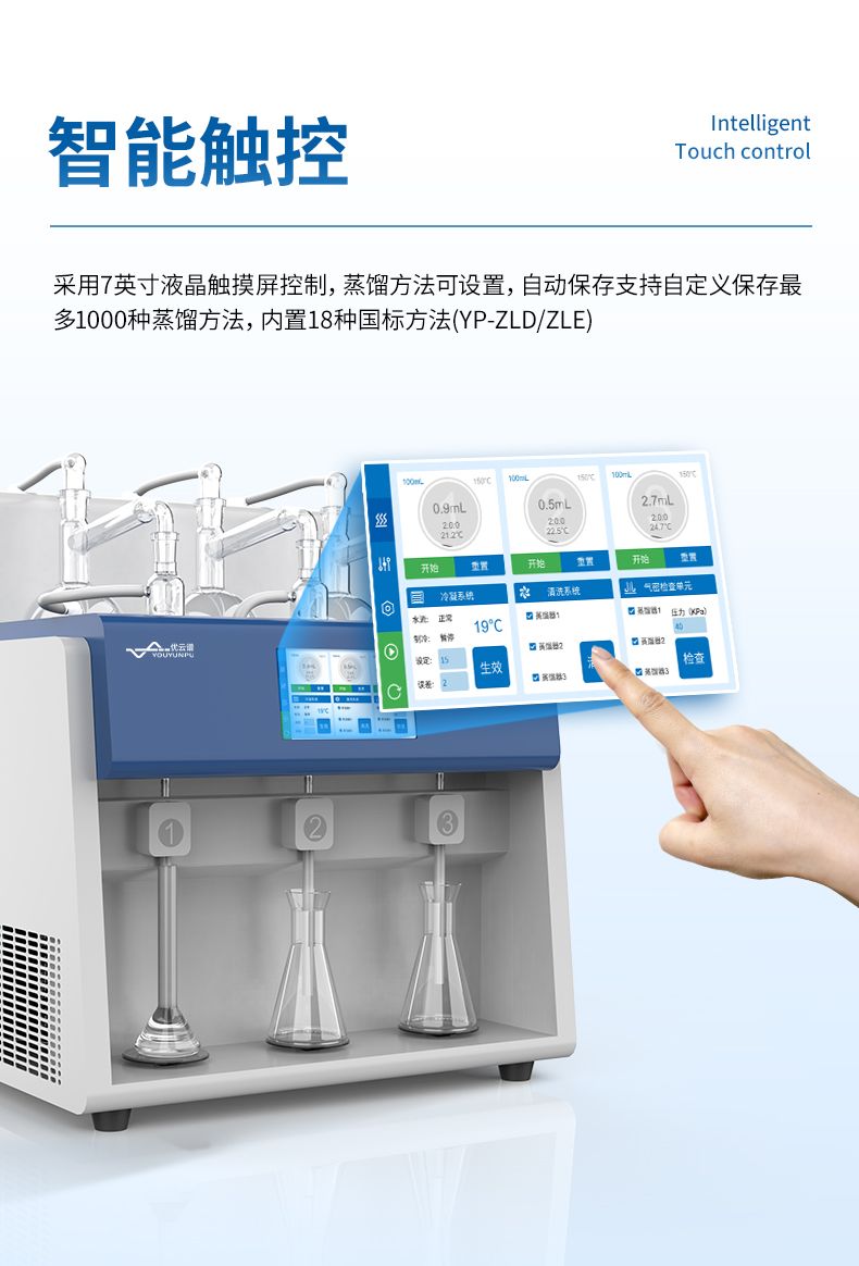 3.智能觸控:7寸液晶觸摸屏,支持自定義保存最多1000種蒸餾方法,內置18種國標方法。