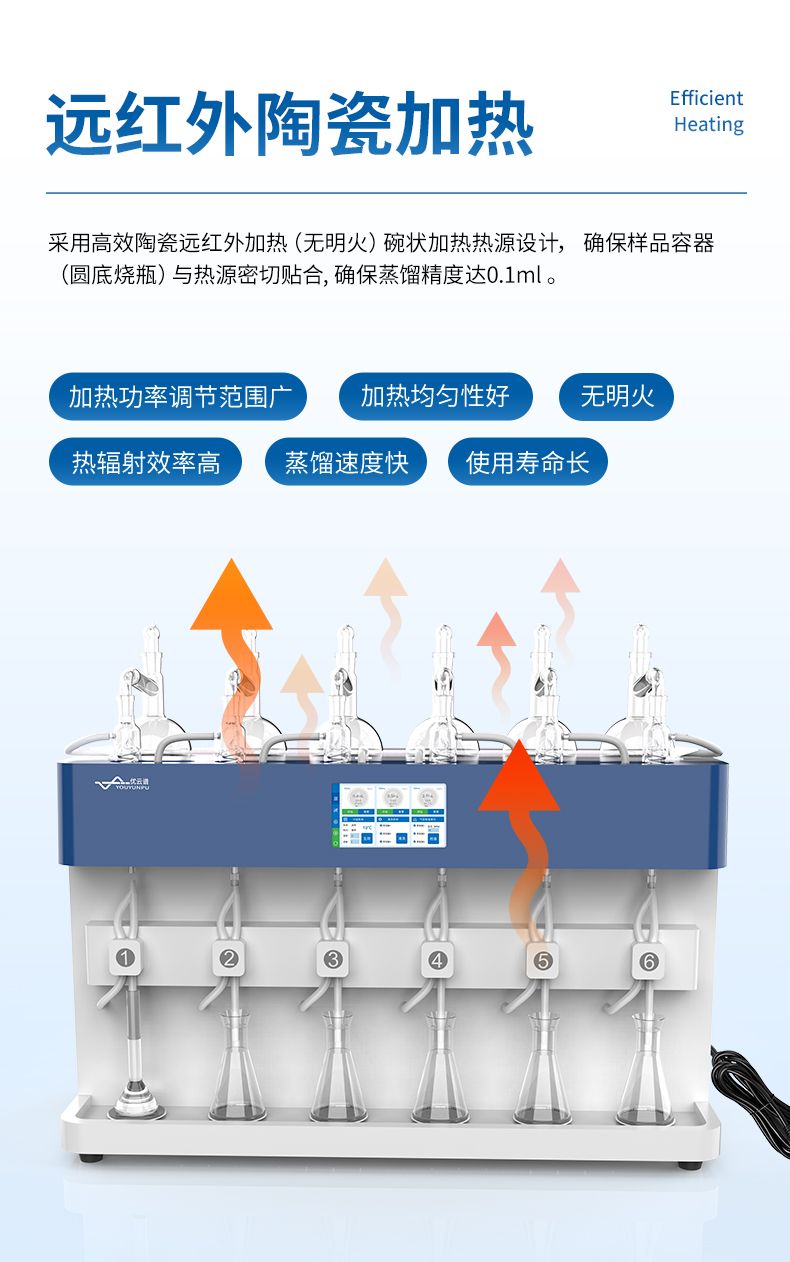 4.精準控制:采用高效陶瓷遠紅外加熱,具備時間與重量雙重終點控制,確保蒸餾精度達0.1ml。