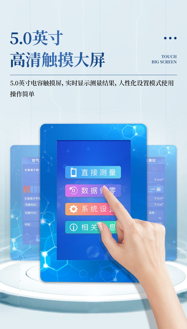 1、屏幕顯示:5.0英寸電容觸摸屏,800*480高分辨率,實時顯示負(氧)離子測量結果;