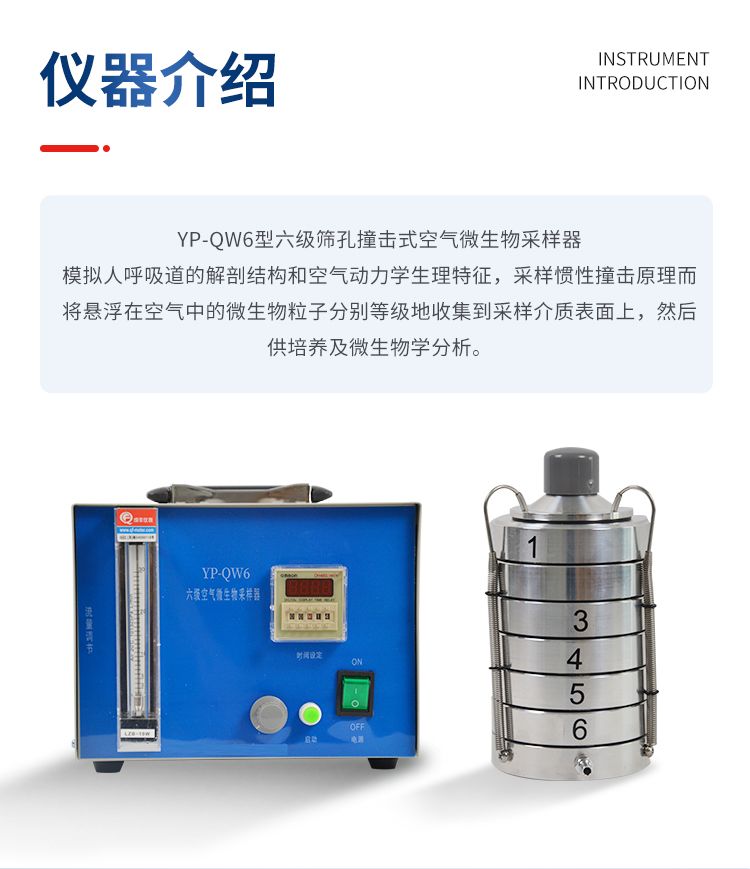 YP-QW6型六級(jí)篩孔撞擊式空氣微生物采樣器模擬人呼吸道的解剖結(jié)構(gòu)和空氣動(dòng)力學(xué)生理特征,采樣慣性撞擊原理而將懸浮在空氣中的微生物粒子分別等級(jí)地收集到采樣介質(zhì)表面上,然后供培養(yǎng)及微生物學(xué)分析。