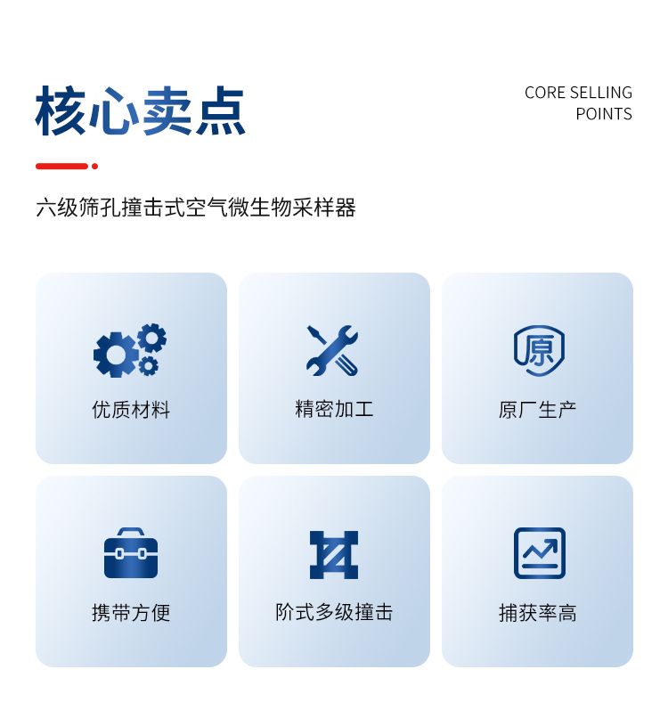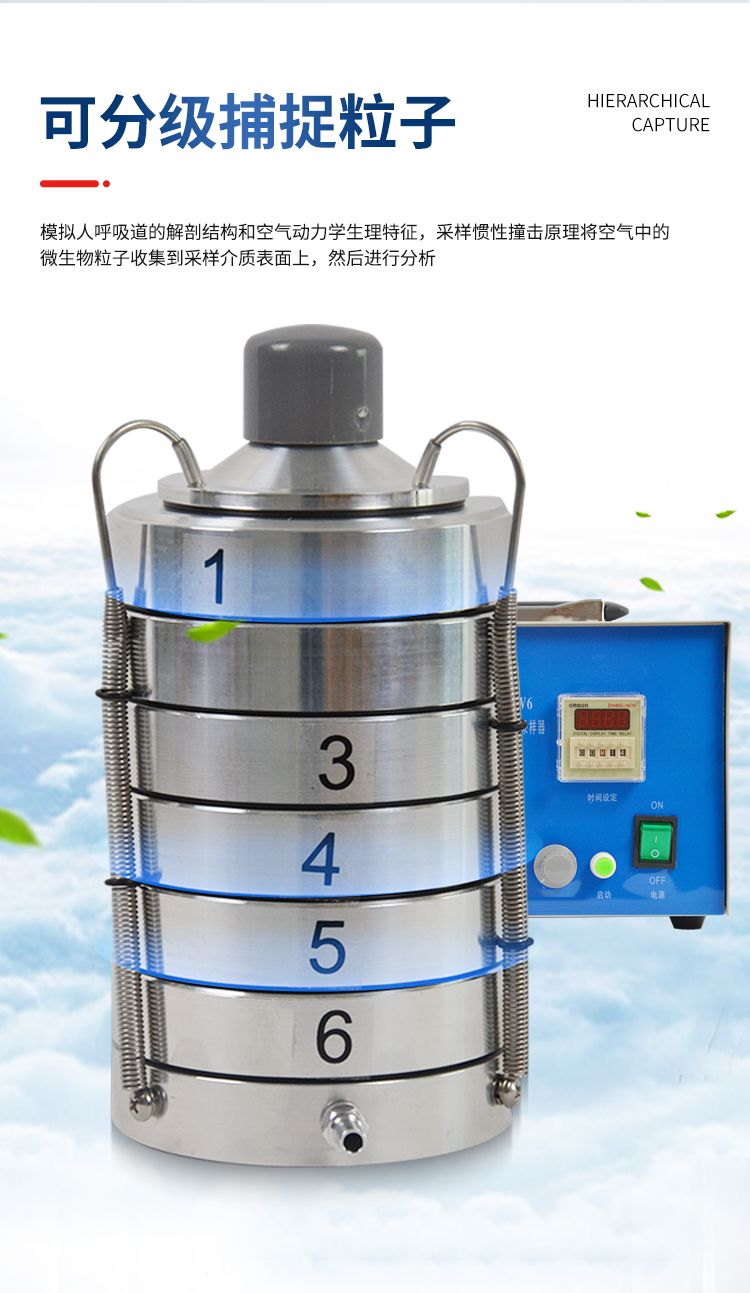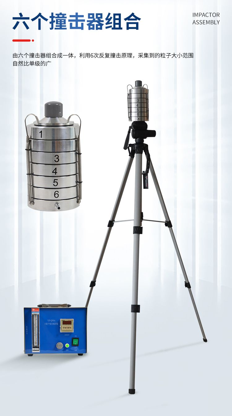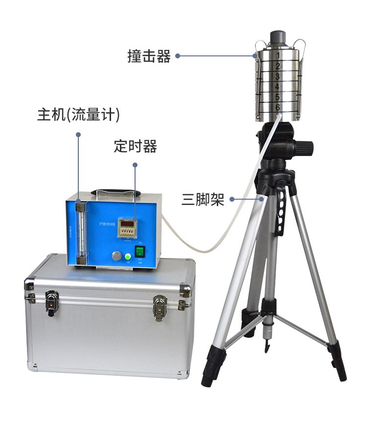 整個(gè)儀器是由撞擊器、主機(jī)(流量計(jì))、定時(shí)器、三腳架組成。撞擊器是6層有微小孔眼的鋁合金圓盤(pán)。圓盤(pán)下放瓊脂平皿,每圓盤(pán)間有密封膠圈,在通過(guò)三個(gè)彈簧掛 鉤把圓盤(pán)牢固地聯(lián)在一起。每個(gè)圓盤(pán)上有400個(gè)成環(huán)行排列、逐層減小、尺寸精確的小孔,標(biāo)準(zhǔn)采樣流量為1立方呎(28.3L/min)。當(dāng)含有微生物粒子 的氣流進(jìn)入最上層的采樣口后,由于氣流的逐層增高,不同大小的微生物粒子按空氣動(dòng)力學(xué)特征分別撞擊在相應(yīng)的瓊脂表面上。捕獲在各級(jí)上的粒子大小范圍是由該 級(jí)孔眼的氣流速度和上一級(jí)的粒子截阻率而決定的。第1、2級(jí)類似人的上呼吸道捕獲的粒子,第3~6級(jí)類似人的下呼吸道捕獲的粒子,這就相當(dāng)程度上復(fù)制了這 些粒子在呼吸道的穿透作用和沉著部位。