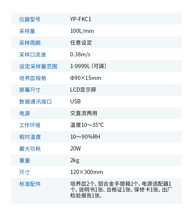 本儀器結構獨特新穎,分上下兩部分,上部分采集口和采樣座及氣泵,下部分控制器及電池。采樣口和外殼采用優質航空鋁制造,表面閉孔處理,便于使用前的滅菌消毒。本儀器功能強大,采樣量大,收集效率高,性能穩定,操作簡便,達到國際同類產品先進水平,是各制藥廠、醫院、生物制品、食品加工、公共場所的檢測部門理想的浮游塵菌濃度采集器。