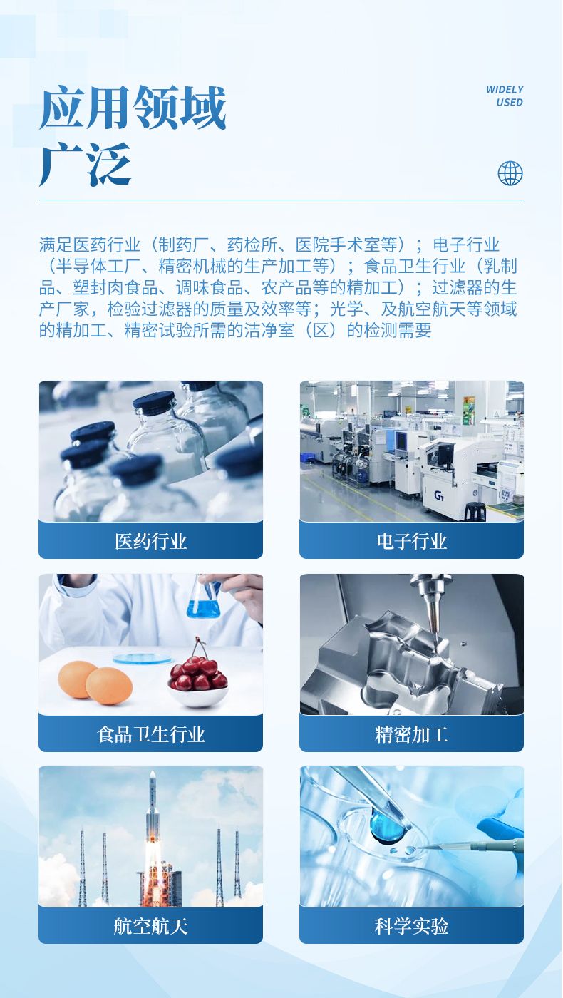 滿足醫(yī)藥行業(yè)(制藥廠、藥檢所、醫(yī)院手術(shù)室等);電子行業(yè)(半導(dǎo)體工廠、精密機(jī)械的生產(chǎn)加工等);食品衛(wèi)生行業(yè)(乳制品、塑封肉食品、調(diào)味食品、農(nóng)產(chǎn)品等的精加工);過(guò)濾器的生產(chǎn)廠家,檢驗(yàn)過(guò)濾器的質(zhì)量及效率等;光學(xué)、及航空航天等領(lǐng)域的精加工、精密試驗(yàn)所需的潔凈室(區(qū))的檢測(cè)需要。