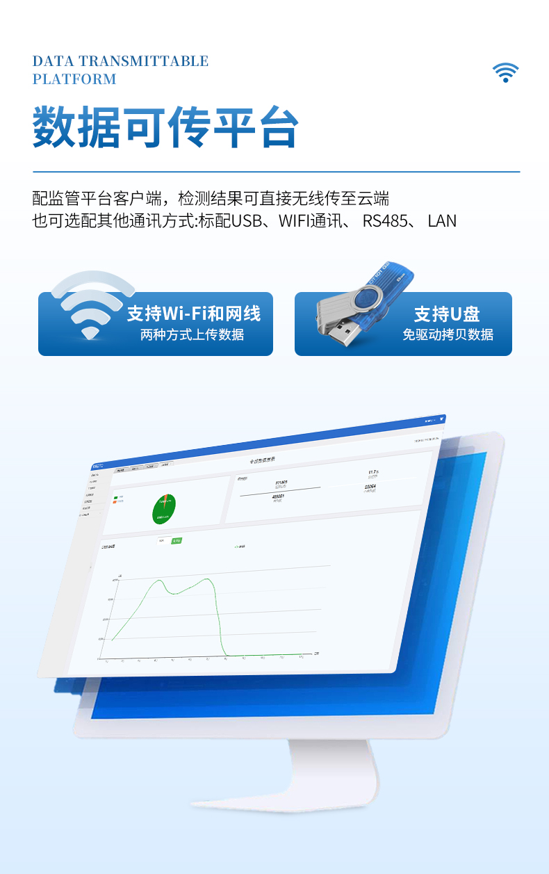 7、支持wifi、網線傳輸,數據可無線、有線上傳云平臺;同時支持U盤拷貝數據,免驅動插拔。