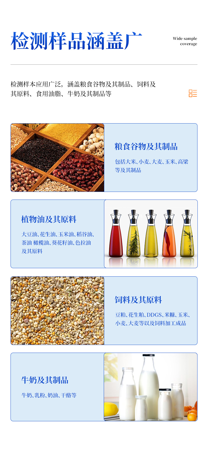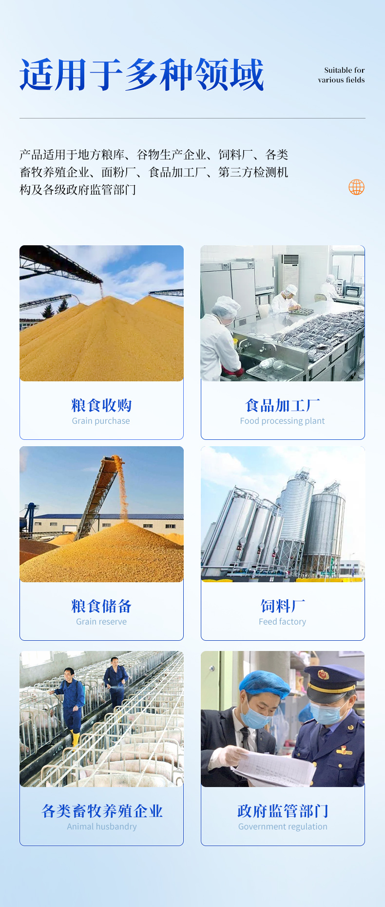 YP-L02型真菌毒素快速檢測儀采用熒光定量快速檢測原理,主要檢測糧油谷物飼料中真菌毒素含量,包括黃曲霉毒素B1、黃曲霉毒素M1、玉米赤霉烯酮、嘔吐毒素、伏馬毒素等等,檢測樣品涵蓋糧食谷物(大米、玉米、小麥、大麥、高粱等)及其制品、飼料及其原料、食用油脂、牛奶及其制品等;樣品前處理簡單,整個(gè)檢測過程檢測12min,產(chǎn)品適用于地方糧庫、谷物生產(chǎn)企業(yè)、飼料廠、各類畜牧養(yǎng)殖企業(yè)、面粉廠、食品加工廠、第三方檢測機(jī)構(gòu)及各級政府監(jiān)管部門。