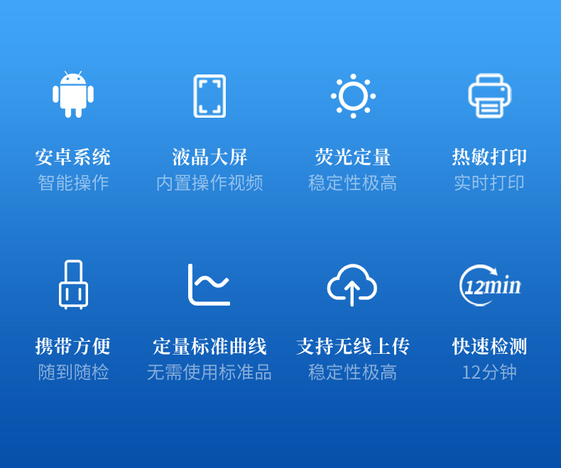 11、檢測判讀:儀器具有開機(jī)自檢功能,12S內(nèi)完成檢測卡判讀,單個(gè)樣本的檢測時(shí)間小于8S。