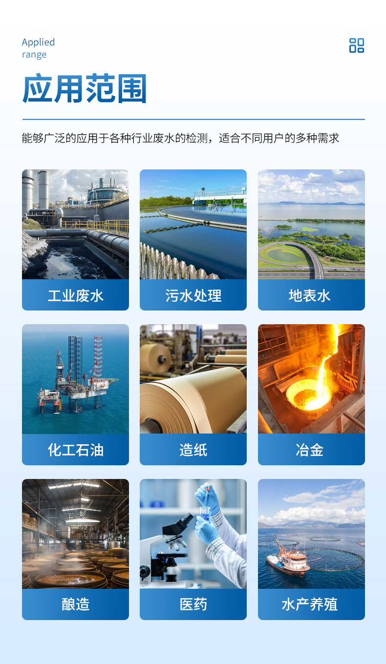 能夠廣泛的應(yīng)用于各種行業(yè)(工業(yè)廢水、城市污水、生活污水及江湖流域地表水)廢水的檢測,可適合不同用戶的多種需求,可在化工、石油、焦化、造紙、冶金、釀造、醫(yī)藥等工業(yè)廢水及各種生活污水監(jiān)測應(yīng)用。