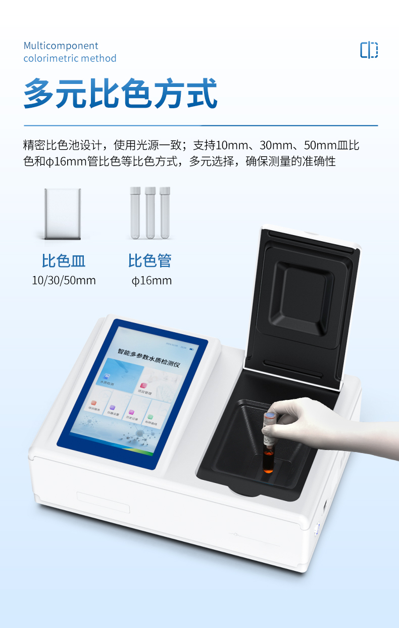 5、支持10mm、30mm、50mm皿比色和φ16mm管比色等比色方式,多元選擇,確保測量的準(zhǔn)確性;