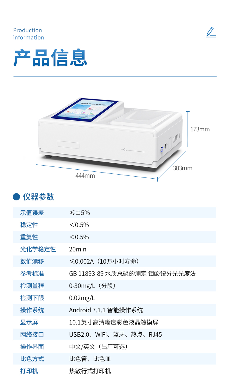 智能總磷測定儀是參考《GB 11893-89 水質(zhì)總磷的測定 鉬酸銨分光光度法》標(biāo)準(zhǔn)設(shè)計制造,主要檢測水質(zhì)總磷濃度指標(biāo);本儀器兼具智能數(shù)據(jù)分析功能,圖表、列表顯示數(shù)據(jù),分析一目了然;高清晰度彩色液晶觸摸顯示屏,Android智能操作系統(tǒng),中文顯示界面,中英文鍵盤,人性化操作,使用更簡單。