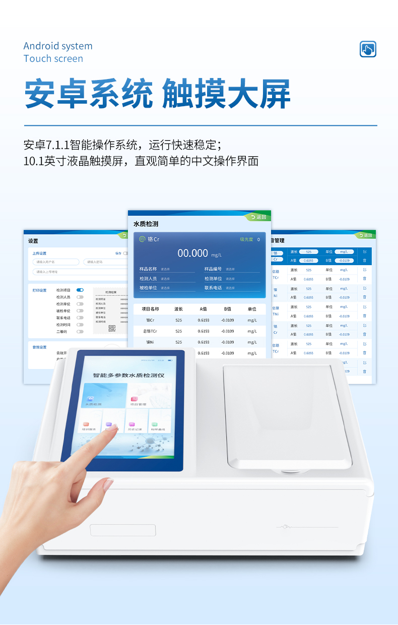 2、10.1英寸液晶觸摸屏顯示,人性化中文操作界面,讀數(shù)直觀、簡單。