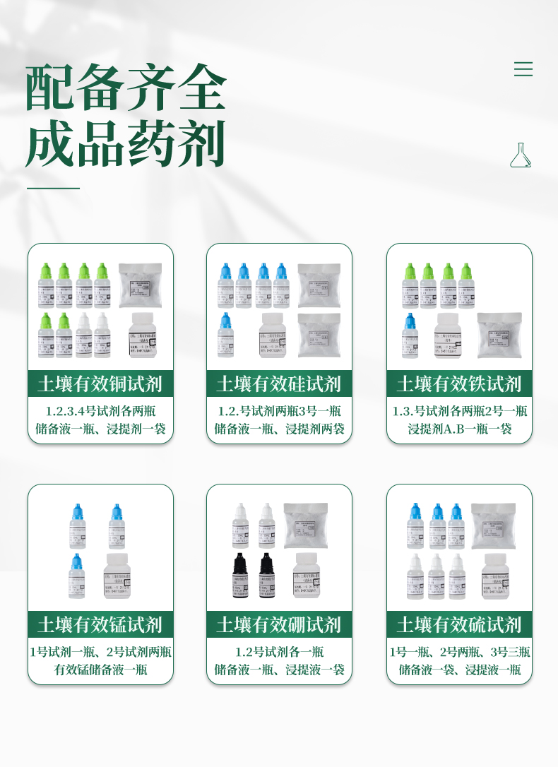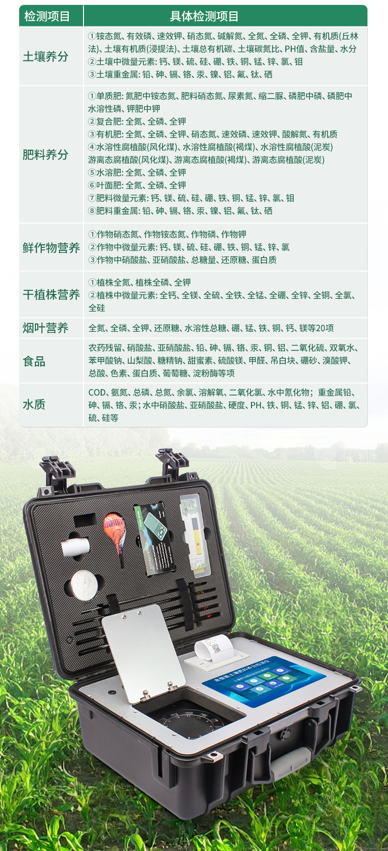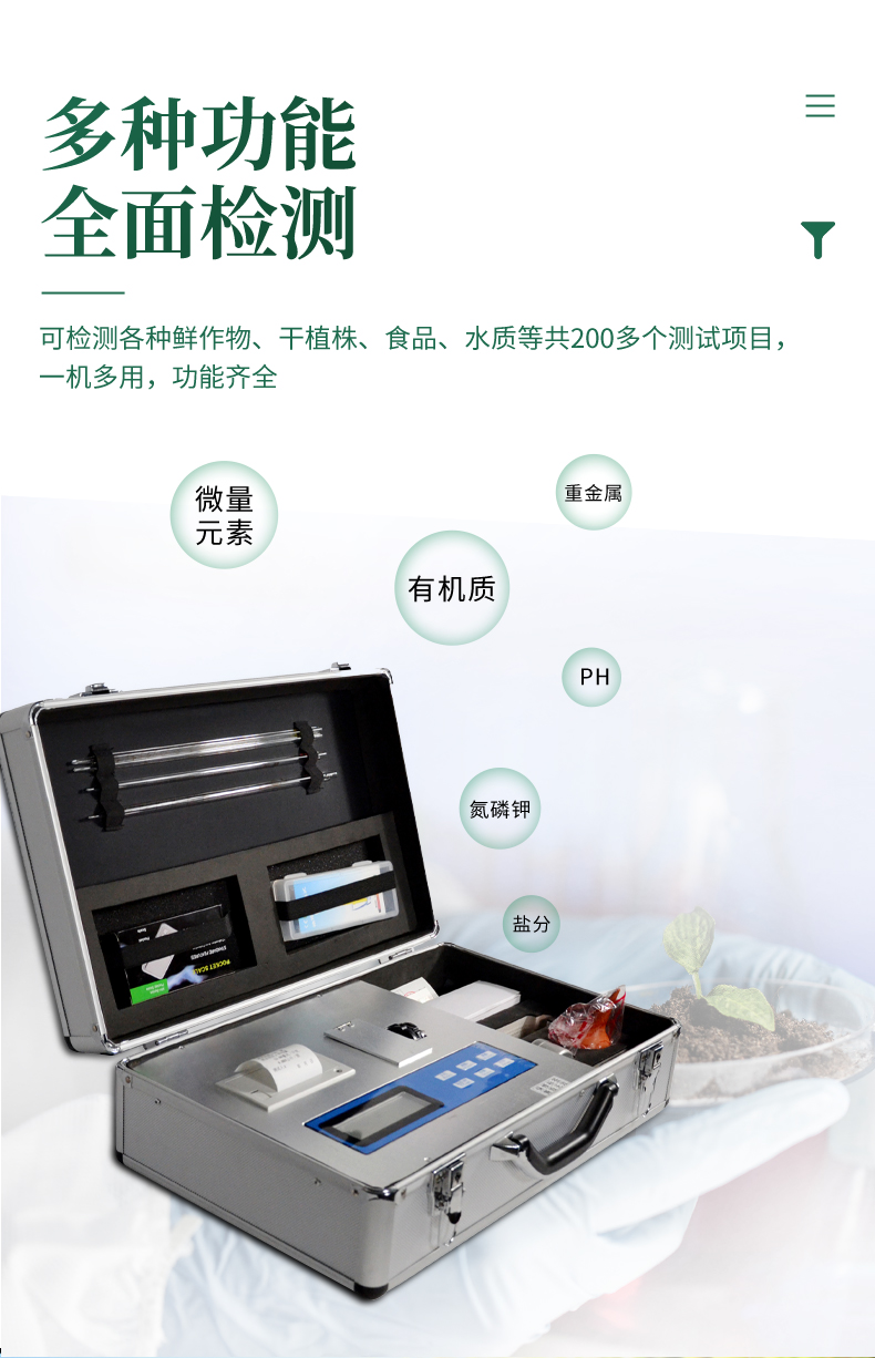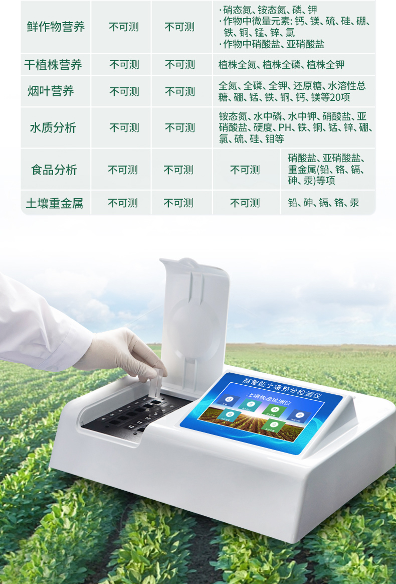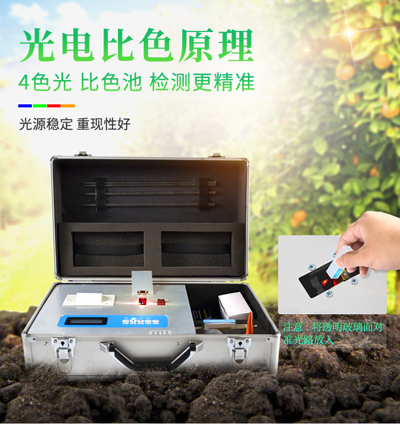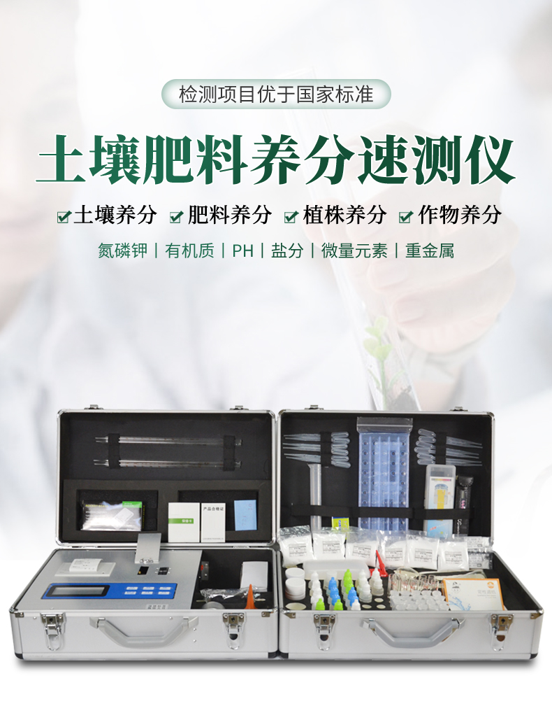 配套齊全:土壤養分速測儀該儀器集藥、器、儀為一體,攜帶方便,相當于一個小型實驗室。適于農業服務部門或農資經銷商、肥料廠商測土施肥和鑒別肥料真假。