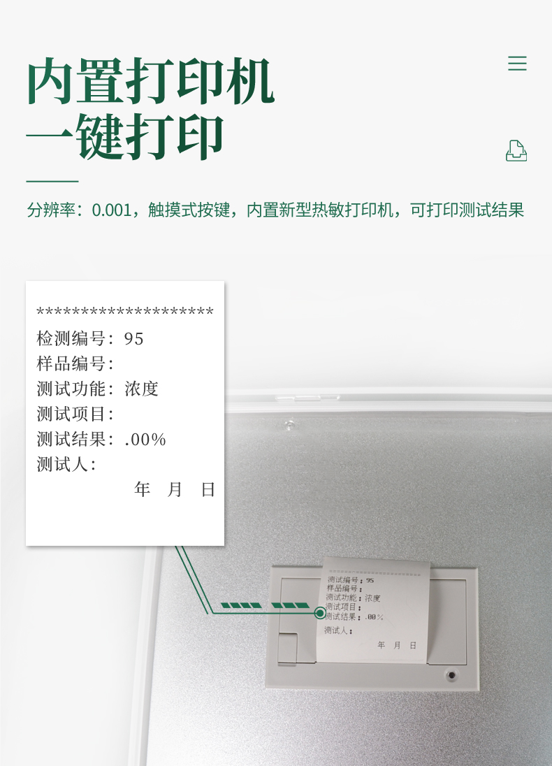 3、分辨率:0.001,觸摸式按鍵,內置熱敏打印機,可打印測試結果。