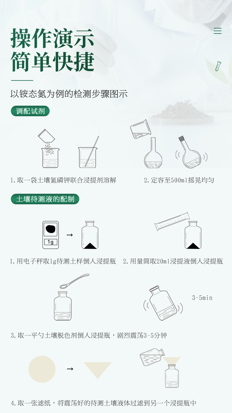 測一個土樣(N、P、K)≤30分鐘,同時檢測三個土樣(N、P、K)≤40分鐘。