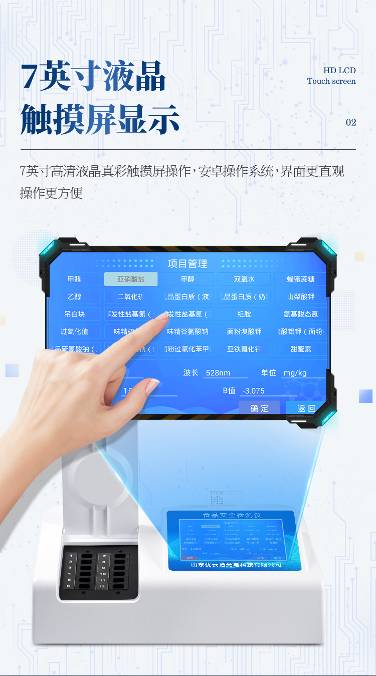 可快速檢測各類食品中的甲醛、吊白塊、二氧化硫、亞硝酸鹽、雙氧水、硼砂、農(nóng)藥殘留、乳及乳制品中蛋白質(zhì)的含量,儀器預(yù)留其他項(xiàng)目檢測程序和端口,根據(jù)日后需求可方便的自主增加檢測項(xiàng)目。