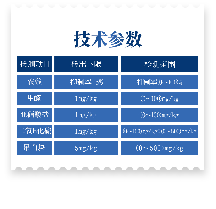 1、農(nóng) 殘: 檢出下限:抑制率 5% ,檢測范圍:抑制率(0~100)%