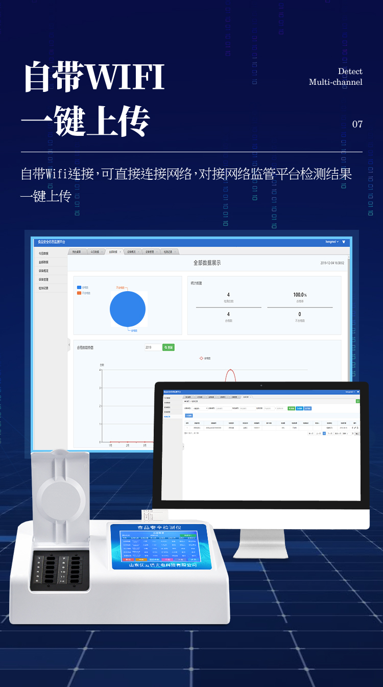 8、儀器帶有監(jiān)管平臺。數(shù)據(jù)可局域網(wǎng)和互聯(lián)網(wǎng)數(shù)據(jù)上傳,檢測結(jié)果直接傳至食品安全監(jiān)管平臺。進(jìn)行區(qū)域食品安全監(jiān)管及大數(shù)據(jù)分析處理,檢測區(qū)域食品安全長短期動態(tài),達(dá)到食品安全問題預(yù)估、預(yù)警