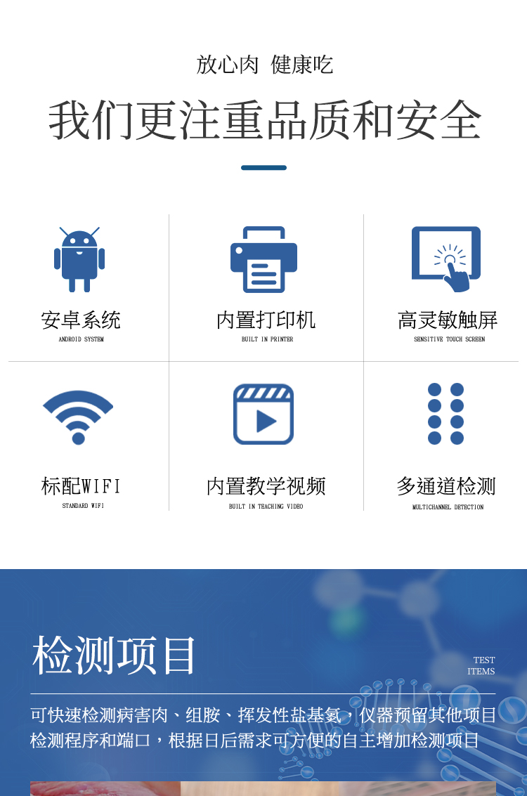 可快速檢測病害肉、組胺、揮發性鹽基氮,儀器預留其他項目檢測程序和端口,根據日后需求可方便的自主增加檢測項目。